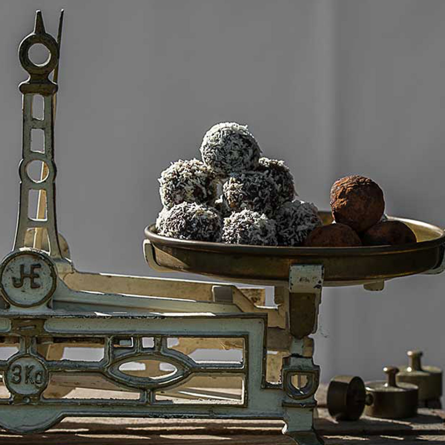 Die Kugeln wahlweise in Kokosraspeln oder Kakaopulver wälzen.