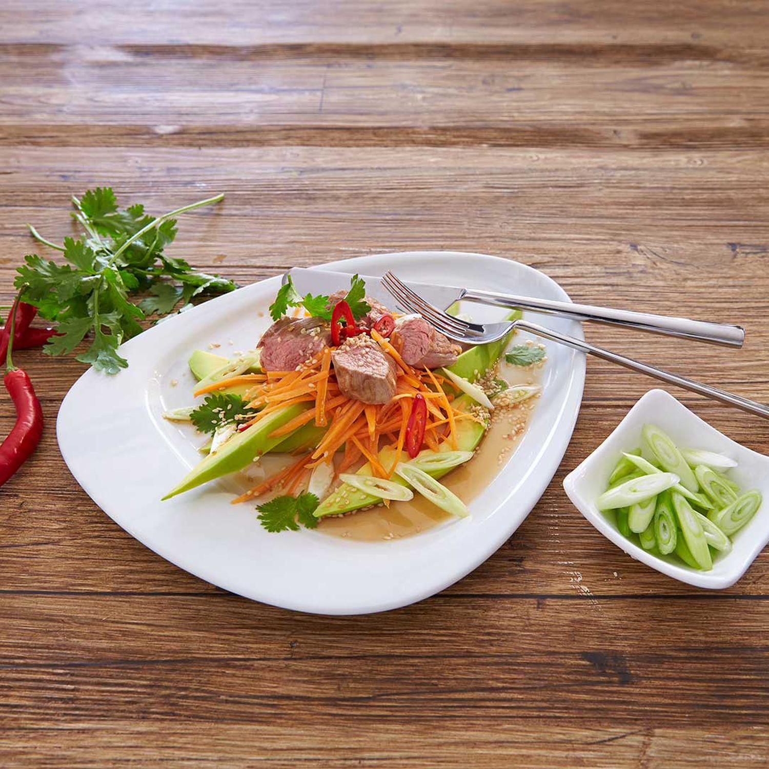 Steaks in Streifen schneiden und mit Gemüse auf Tellern anrichten. Die Avocadostücke darauf platzieren. Mit der übrigen Marinade beträufeln und Sesam darüberstreuen.