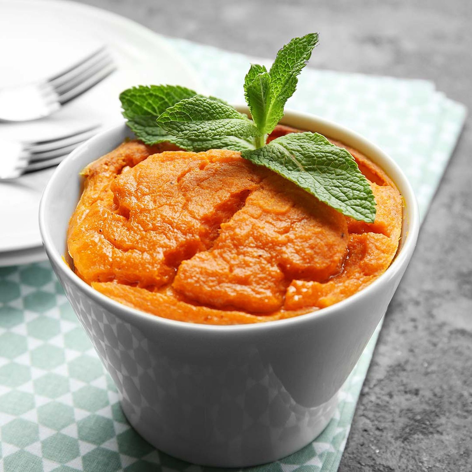 Eier trennen. Eigelb mit Obers und der Karottenmasse vermengen. Eiweiß steif schlagen und unterheben. Die fertige Masse in die eingefetteten Soufflé-Förmchen füllen – dabei etwa 1 cm unter dem Rand aussparen.