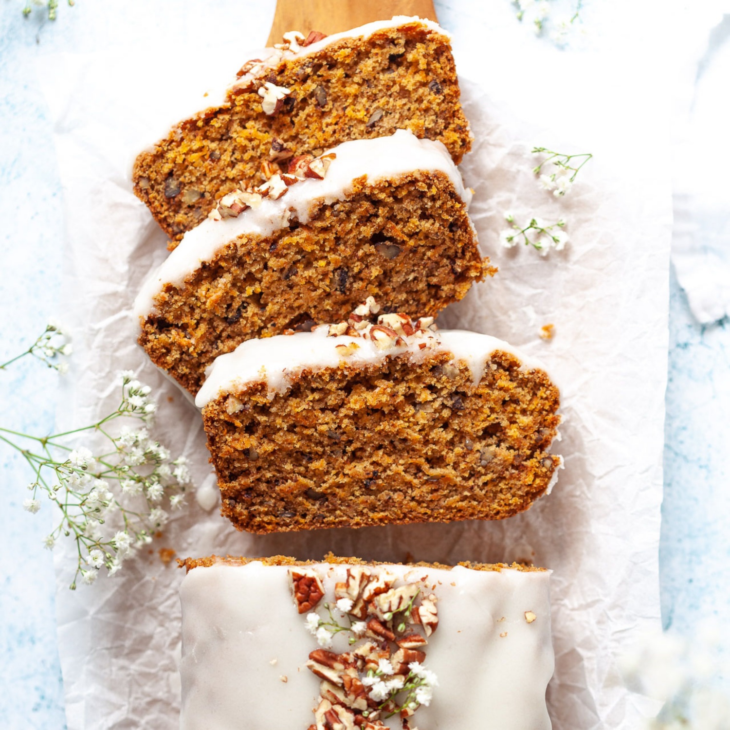 Die Glasur über den abgekühlten Kuchen streichen und mit gehackten Pekannüssen garnieren.