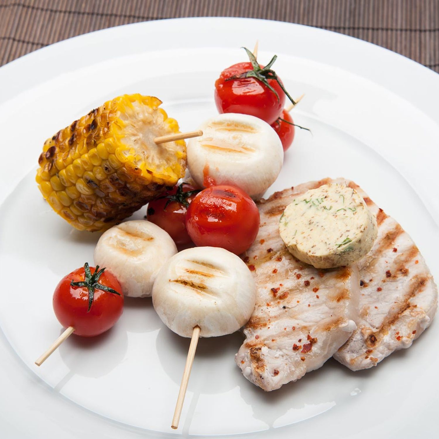 Karreesteak mit gegrilltem Mais und Champignon-Tomaten-Spieß