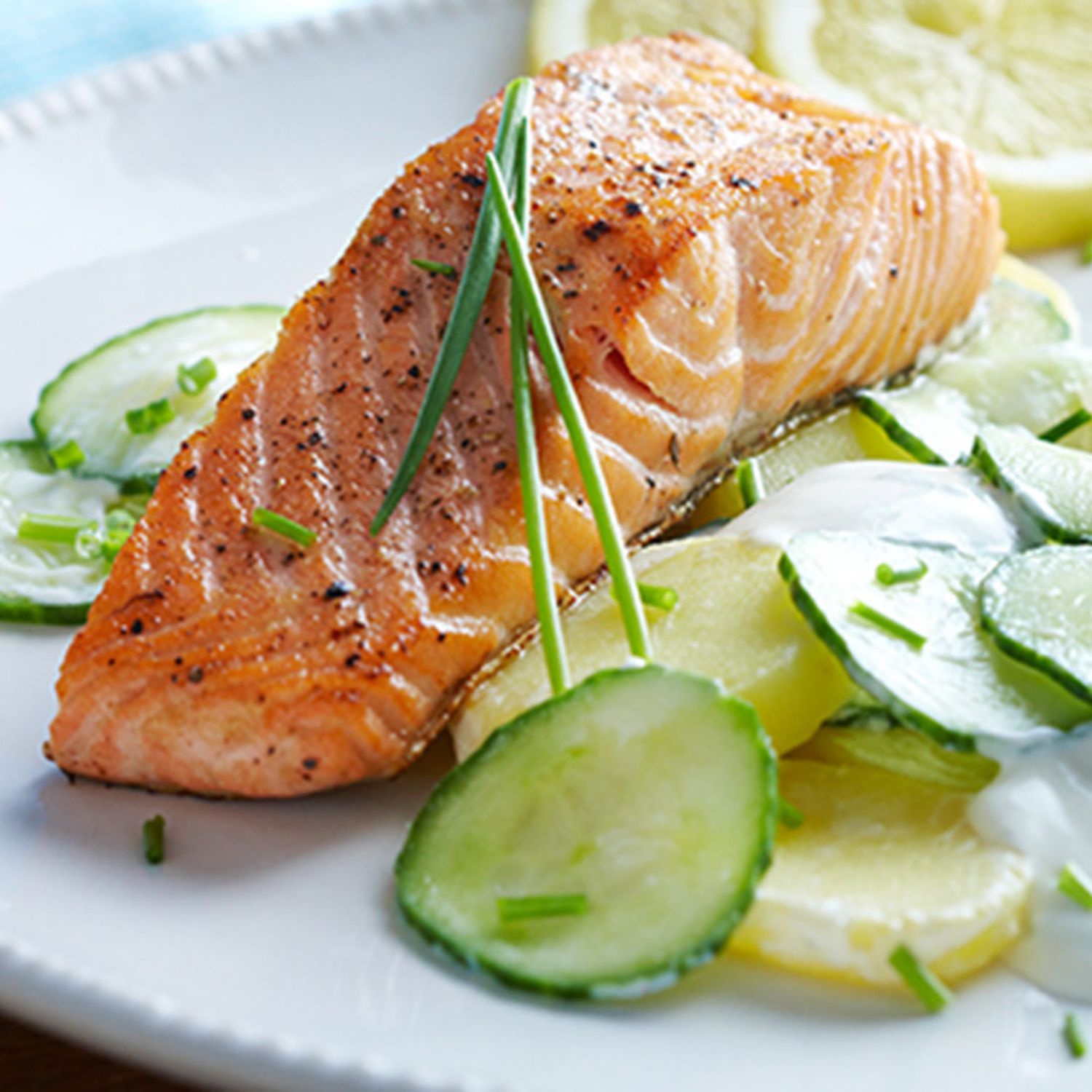 Nicht nur im Sommer ein Genuss: Cremiger Kartoffel-Gurken-Salat mit köstlichem Krendressing in Kombination mit frischem Lachsfilet ist ein schmackhaftes Hauptgericht, das zu jeder Jahreszeit passt!