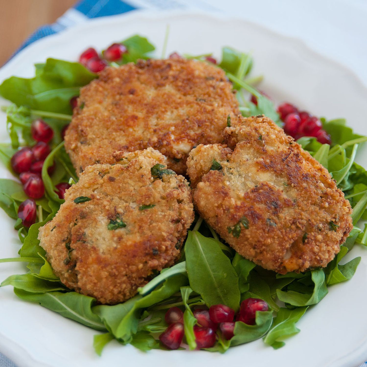 Kopfsalat auf einem Teller anrichten und das Dressing darüber geben. Laibchen auf den Tellern arrangieren und die Haselnüsse über Salat und Laibchen geben.
