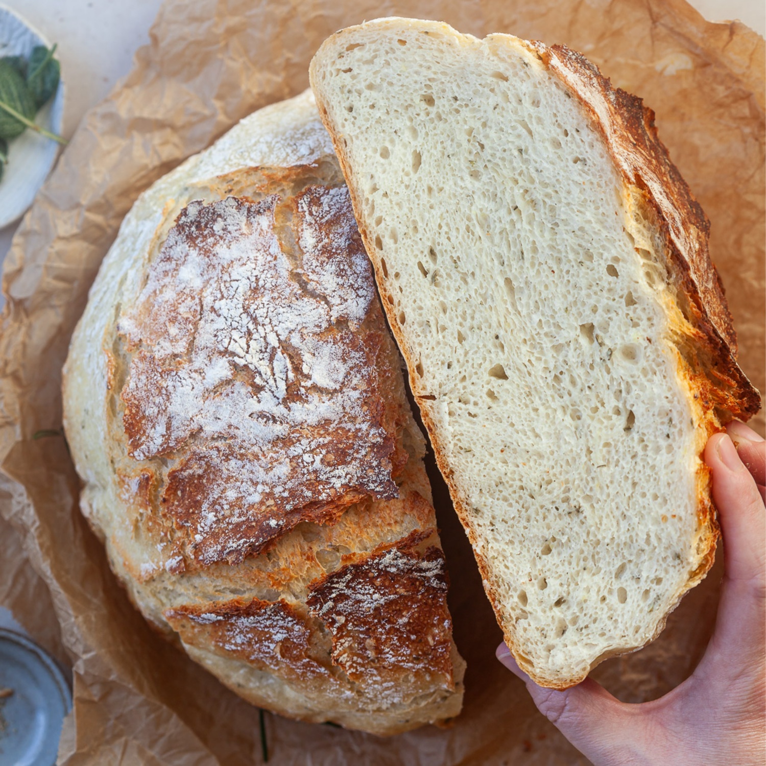9. Backen: Den Teig vorsichtig mit dem Backpapier in den heißen Bräter geben, mit dem Deckel abdecken und 35–40 Minuten backen. Danach den Deckel entfernen und weitere 20–30 Minuten backen, bis die Kruste goldbraun ist. Für eine knusprige Kruste ein Gefäß mit ca. 150 ml Wasser in den Ofen stellen, um Dampf zu erzeugen.