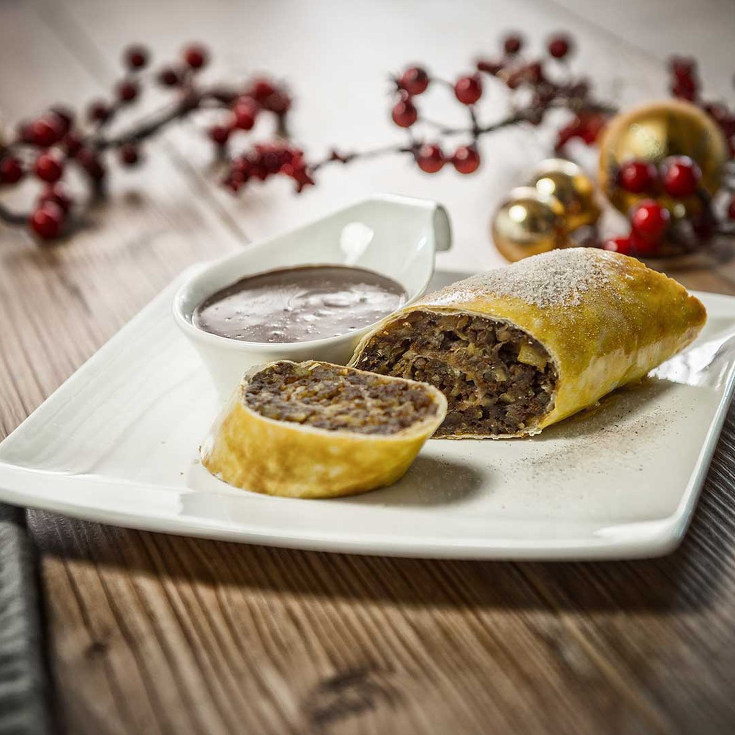 Kastanienstrudel mit leichter Schokosauce