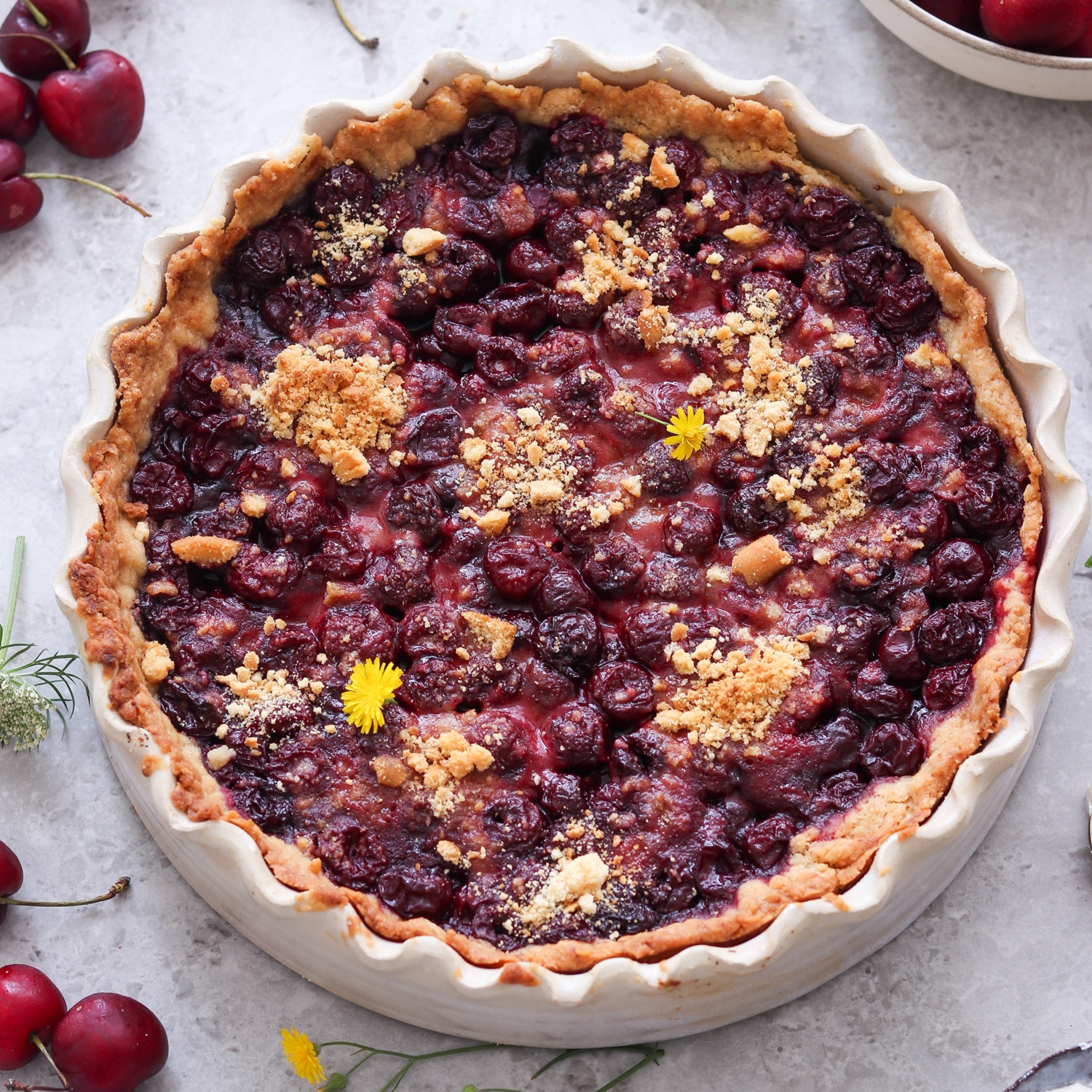 Die entkernten Kirschen mit den restlichen Zutaten für die Füllung in einem Topf köcheln lassen, bis sich alles vermischt hat und eingedickt ist. Die Füllung abkühlen lassen und in den gekühlten Boden geben.