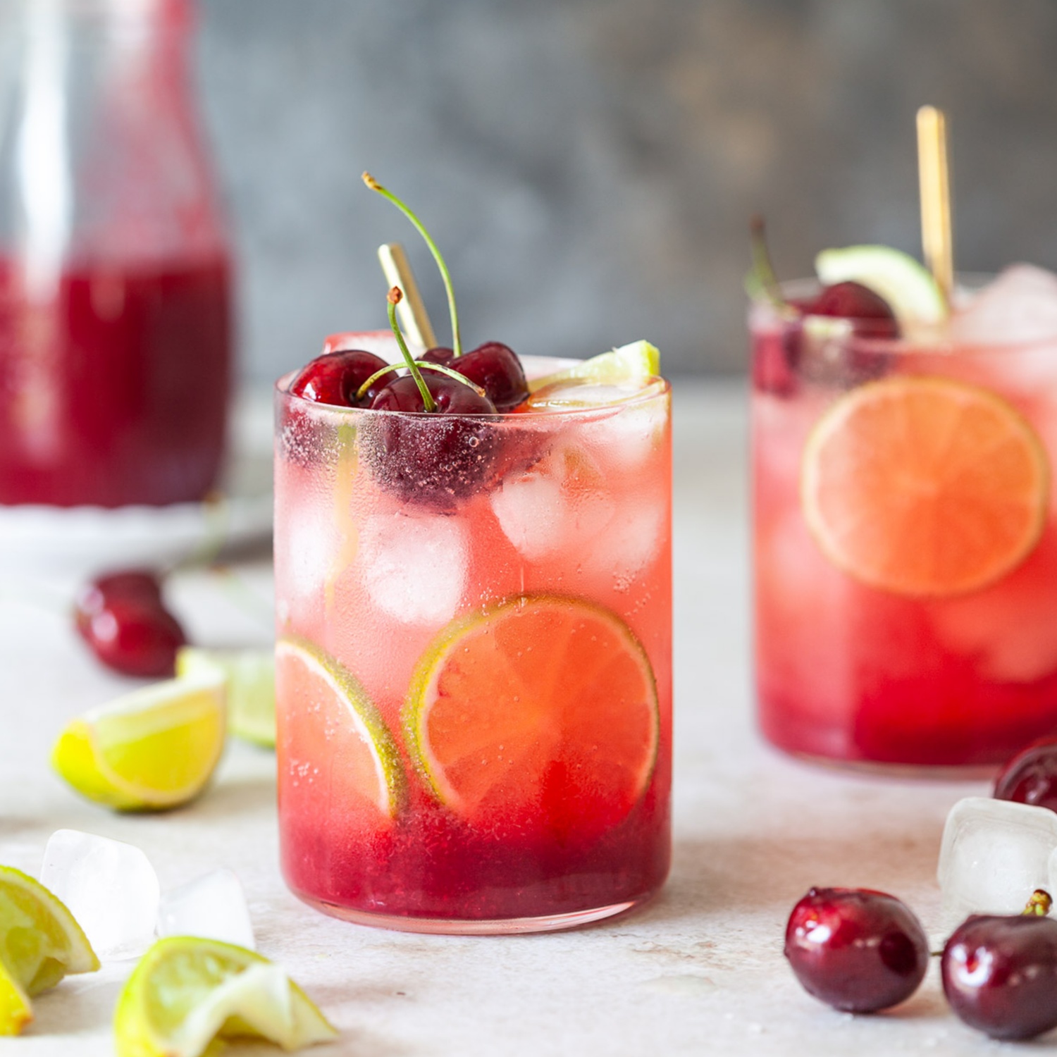 Zwei Gläser mit Eiswürfeln füllen, 2-3 Esslöffel Kirschsirup und ein paar Zitronenscheiben hinzufügen und mit Sodawasser aufgießen.