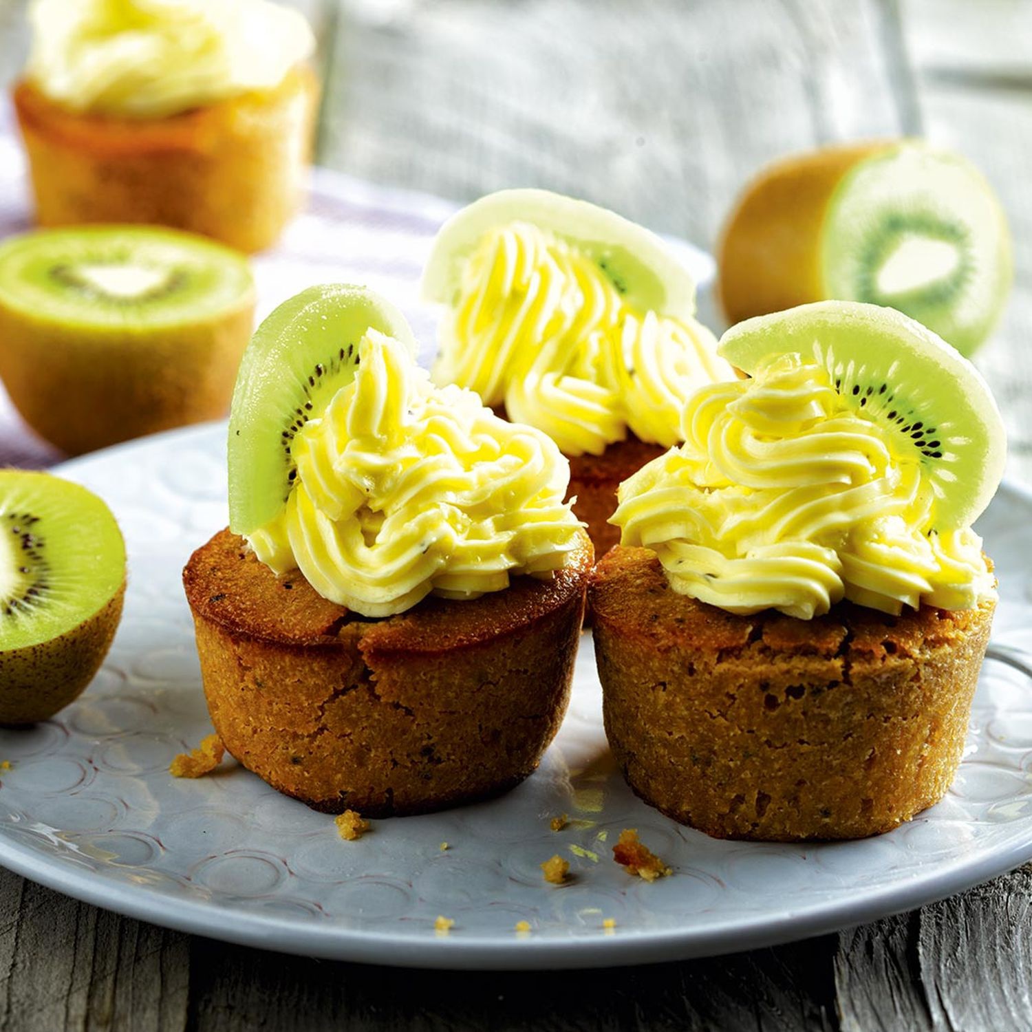 Die fertigen Muffins gut auskühlen lassen und dann mit Hilfe eines Spritzbeutels und einer großer Sterntülle mit der Buttercreme dekorieren. Die letzte Kiwi schälen, halbieren, in Scheiben schneiden und die Kiwi-Cupcakes damit verzieren.