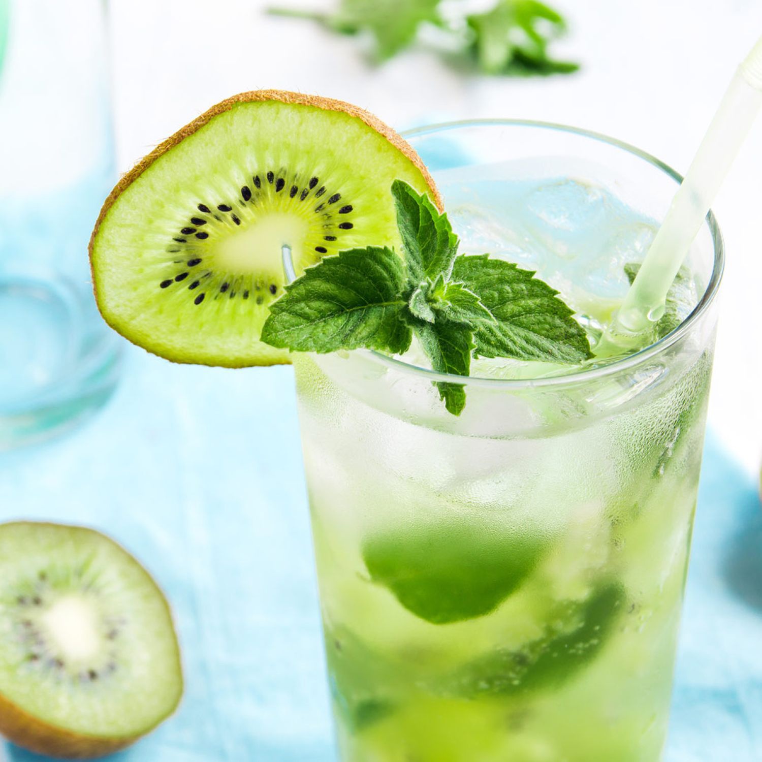 Lassen Sie sich den sommerlich-frischen Kiwi-Minz-Mojito schmecken. Ideal als erfrischender Aperitif an heißen Sommertagen.