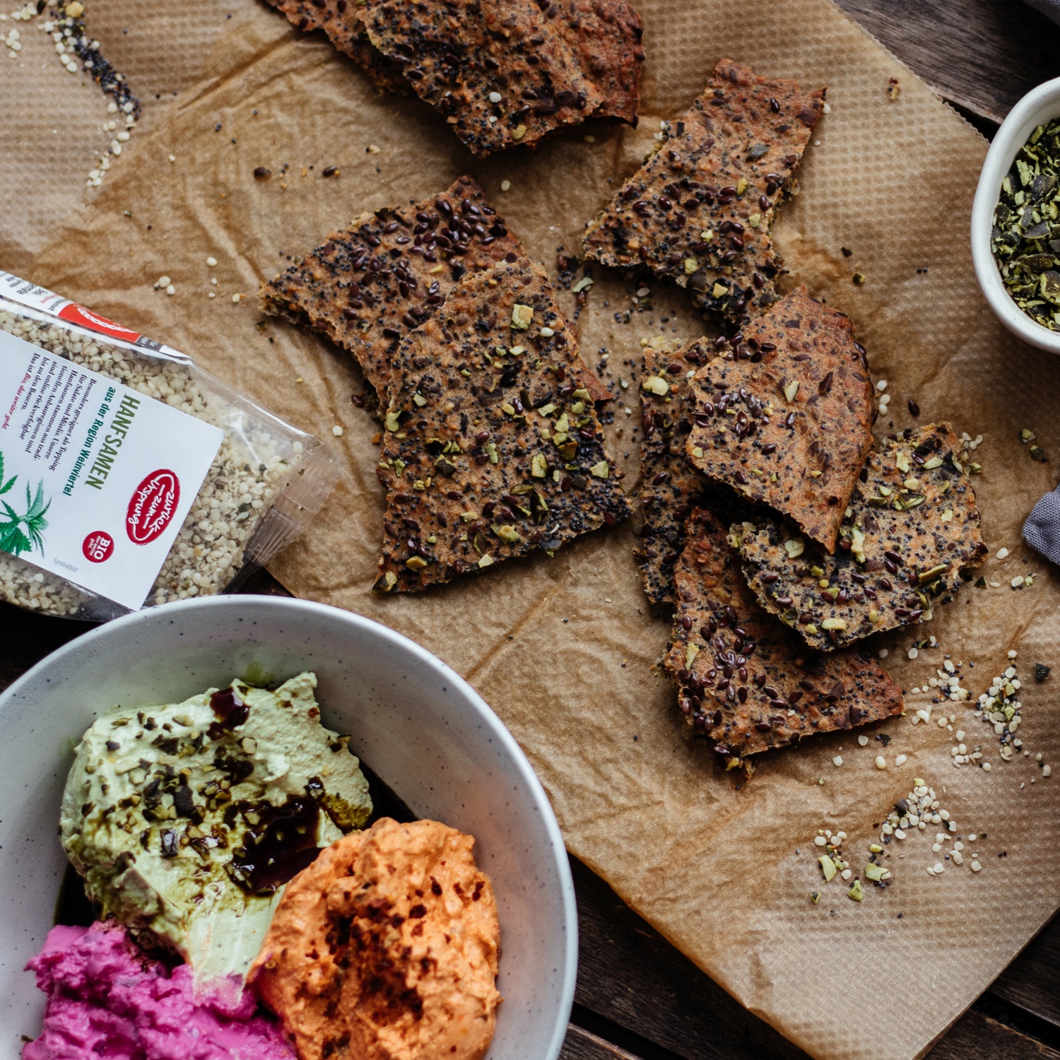 Die Masse dünn auf einem Backpapier ausstreichen und optional noch mit Samen bzw. Kürbiskernen bestreuen. Nun solange backen, bis es knusprig ist. (ca. 1h) Zwischendurch immer wieder die Feuchtigkeit aus dem Ofen entweichen lassen.