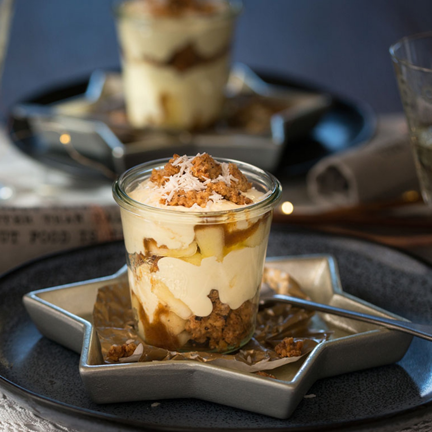 Nun werden alle Zutaten in die Dessertteller geschichtet. Mit den Äpfeln starten, die Äpfel mit der Karamellsoße beträufeln. Nun das Granola darüber bröseln und Mascarponecreme darüber verteilen. Den Vorgang nochmals wiederholen. Mit der Creme abschließen. Kurz vor dem Servieren mit Granola bestreuen und mit den Kokosraspeln garnieren.