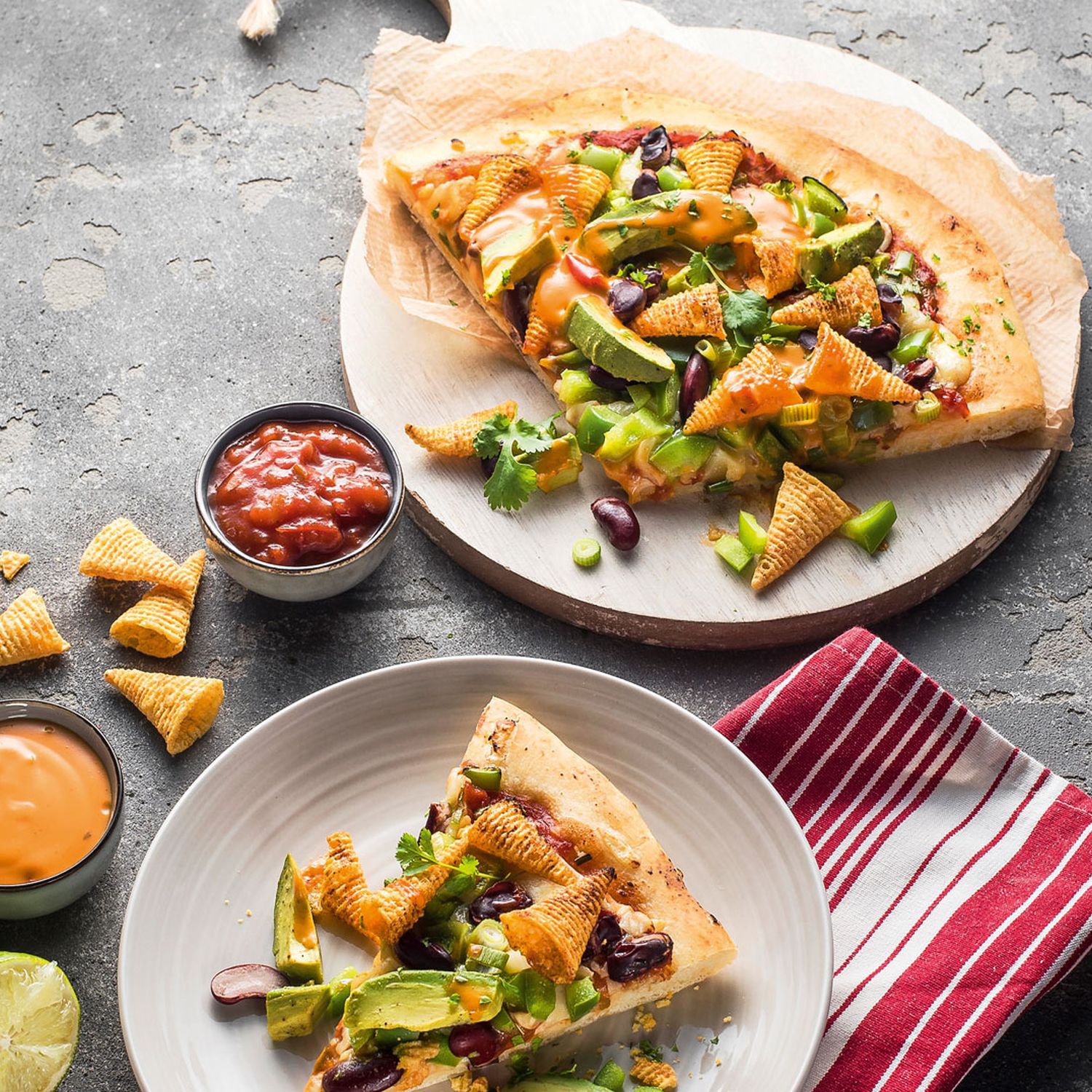 In der Zwischenzeit die Avocado schälen, entkernen und klein schneiden. Diese mit Salz und Pfeffer würzen. Die Pizza mit den Avocado Würfel und den Nachos bestreuen und anschließend mit dem Salsa Käse Dip bestreichen. Die Pizza weitere 5 Minuten backen.