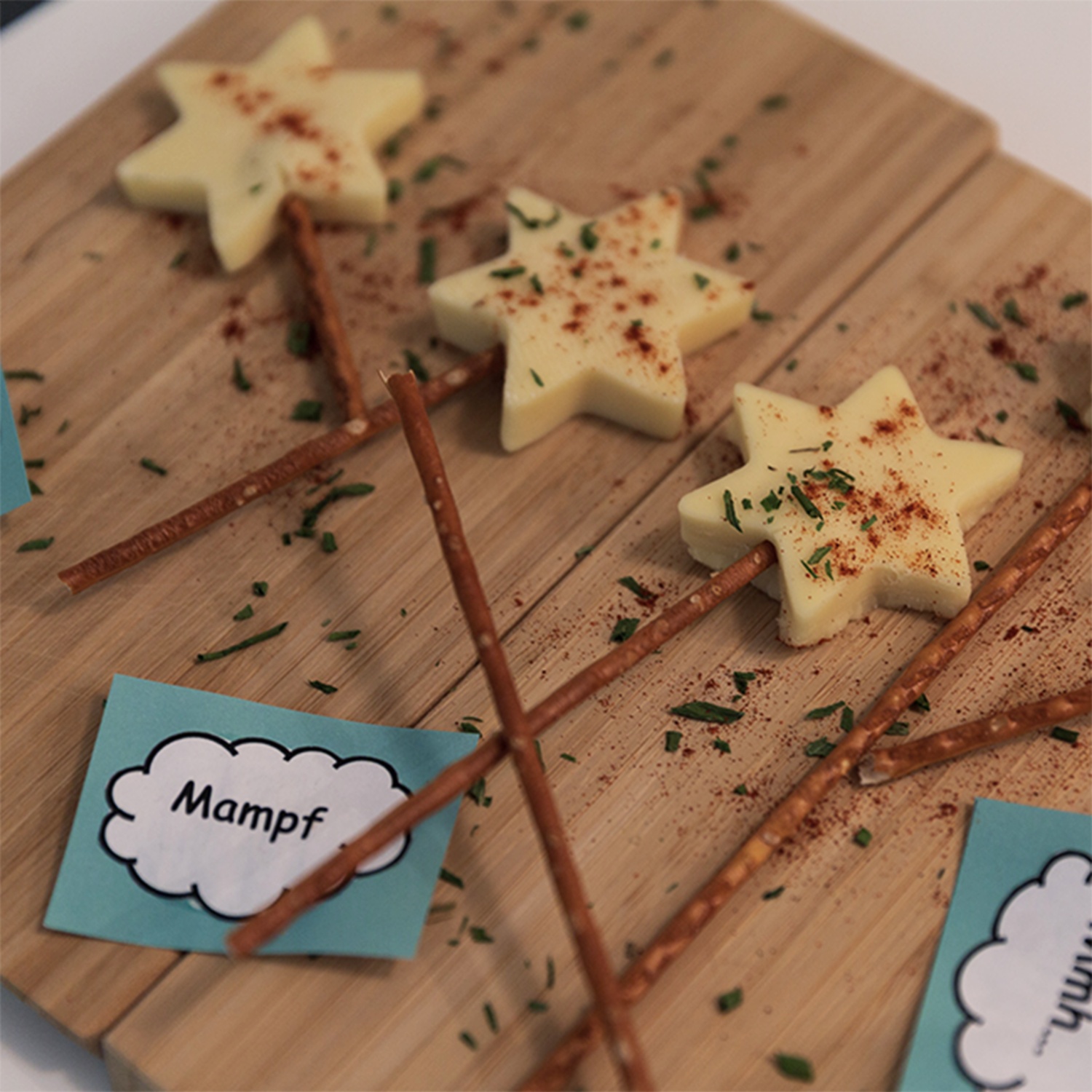 Aus einem Block Gouda Sterne ausstechen. Die Salzstangen hinenstecken und etwas würzen. Voilà: Der Zauberstab ist fertig!