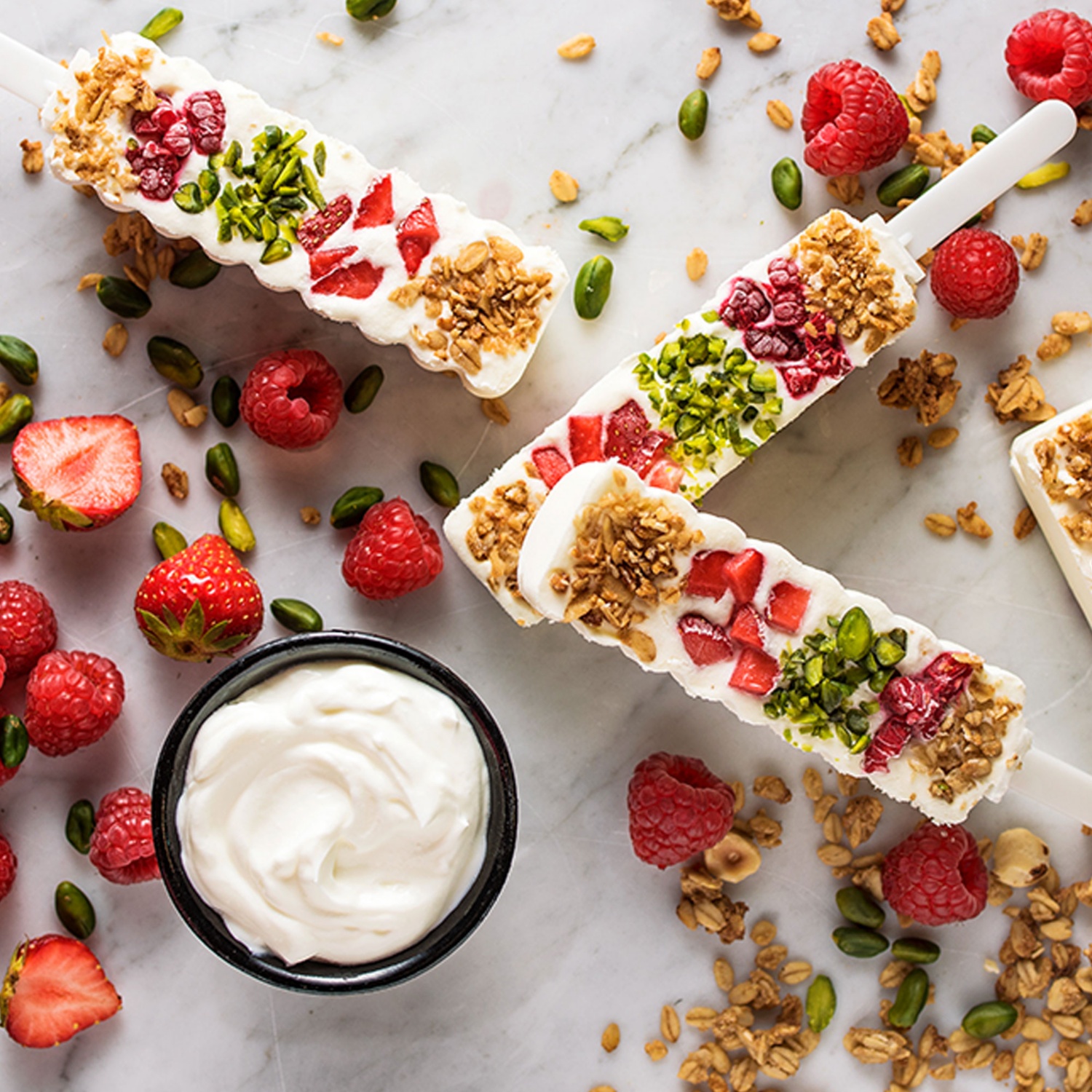 Die Hälfte der Beeren, die Pistazien und das Müsli dekorativ in die leeren Eisformen legen und die Formen vorsichtig mit der Joghurtcreme befüllen.