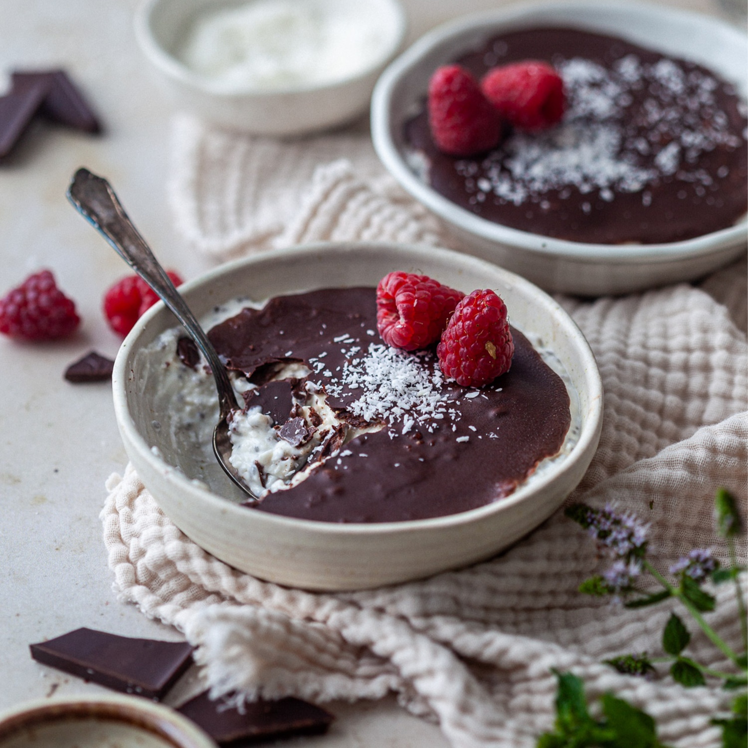 6. Das Semifreddo zusammenstellen: Die geschmolzene Schokolade über die Joghurt-Kokos-Mischung in jede Schale gießen.