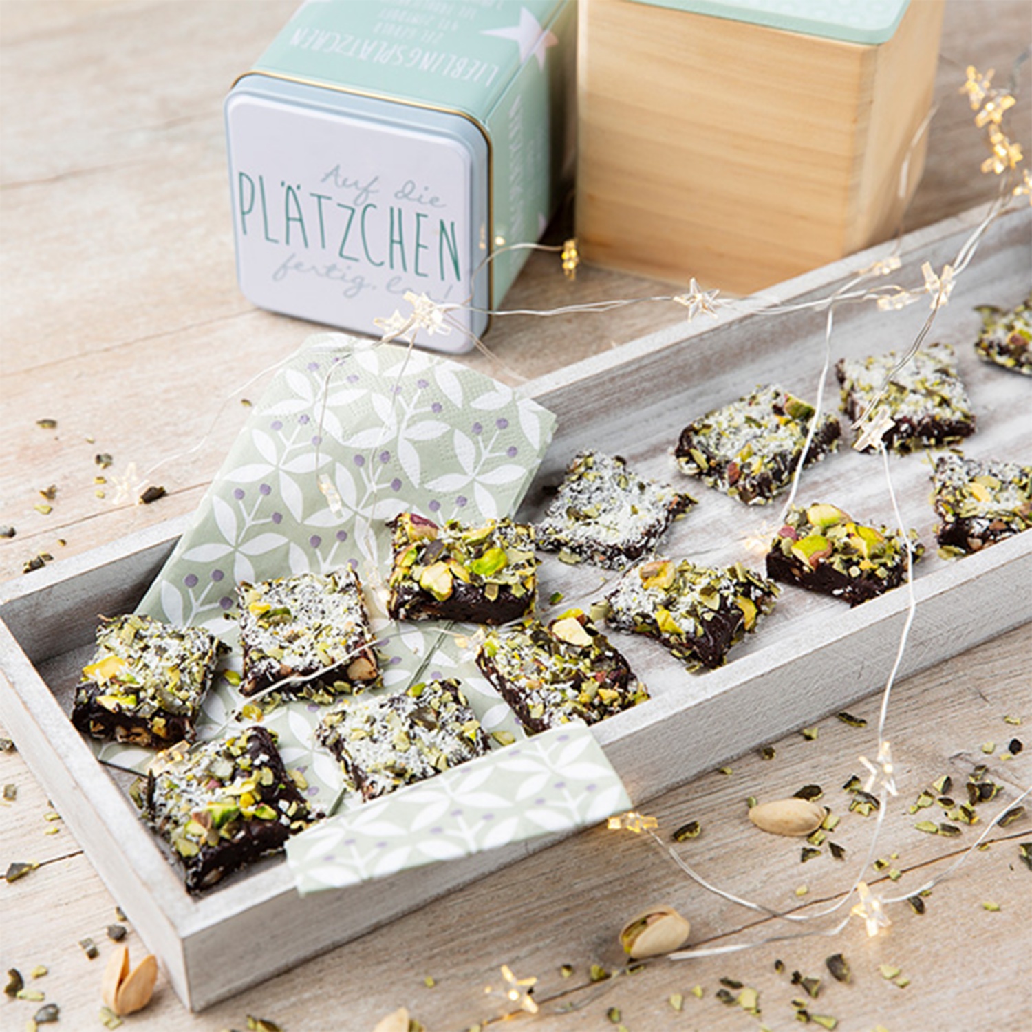 Die Backform mit Frischhaltefolie auslegen. Die Hälfte der Streusel auf den Boden in die Form streuen. Anschließend die Schokomischung auf die Streusel geben und glattstreichen. Nundie restlichen Streusel auf der Masse verteilen und leicht andrücken. Jetzt die Formabdecken und das Konfekt für circa zwei Stunden kaltstellen.