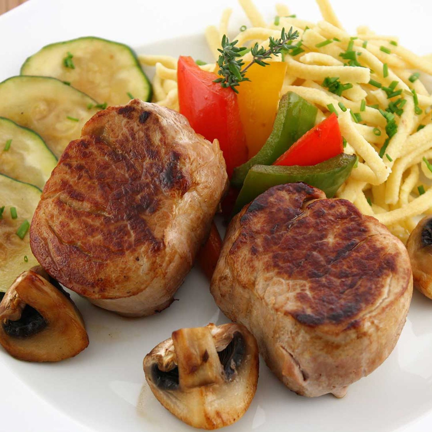 Kräuter-Käsespätzle mit gebratenem Schweinefilet und Walnüssen
