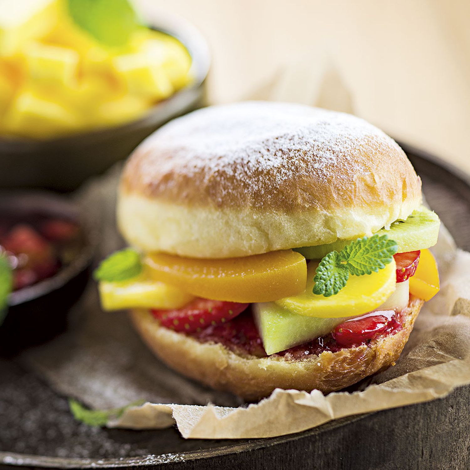 Probiere Sie den Krapfenburger mit Obst gefüllt. Je nach Saison kann der süße Burger mit frischem Obst zu einer leckeren, abwechslungsreichen Nachspeise werden!