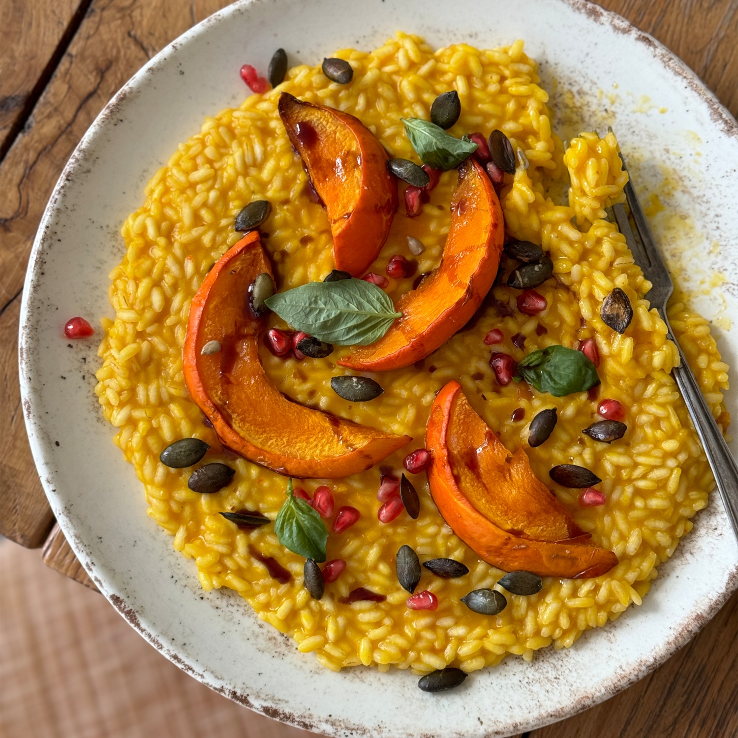Das Risotto auf zwei Teller verteilen und mit den restlichen gerösteten Kürbisspalten, Kürbiskernen, Granatapfelkernen und einem Spritzer Kürbiskernöl garnieren. Guten Appetit!