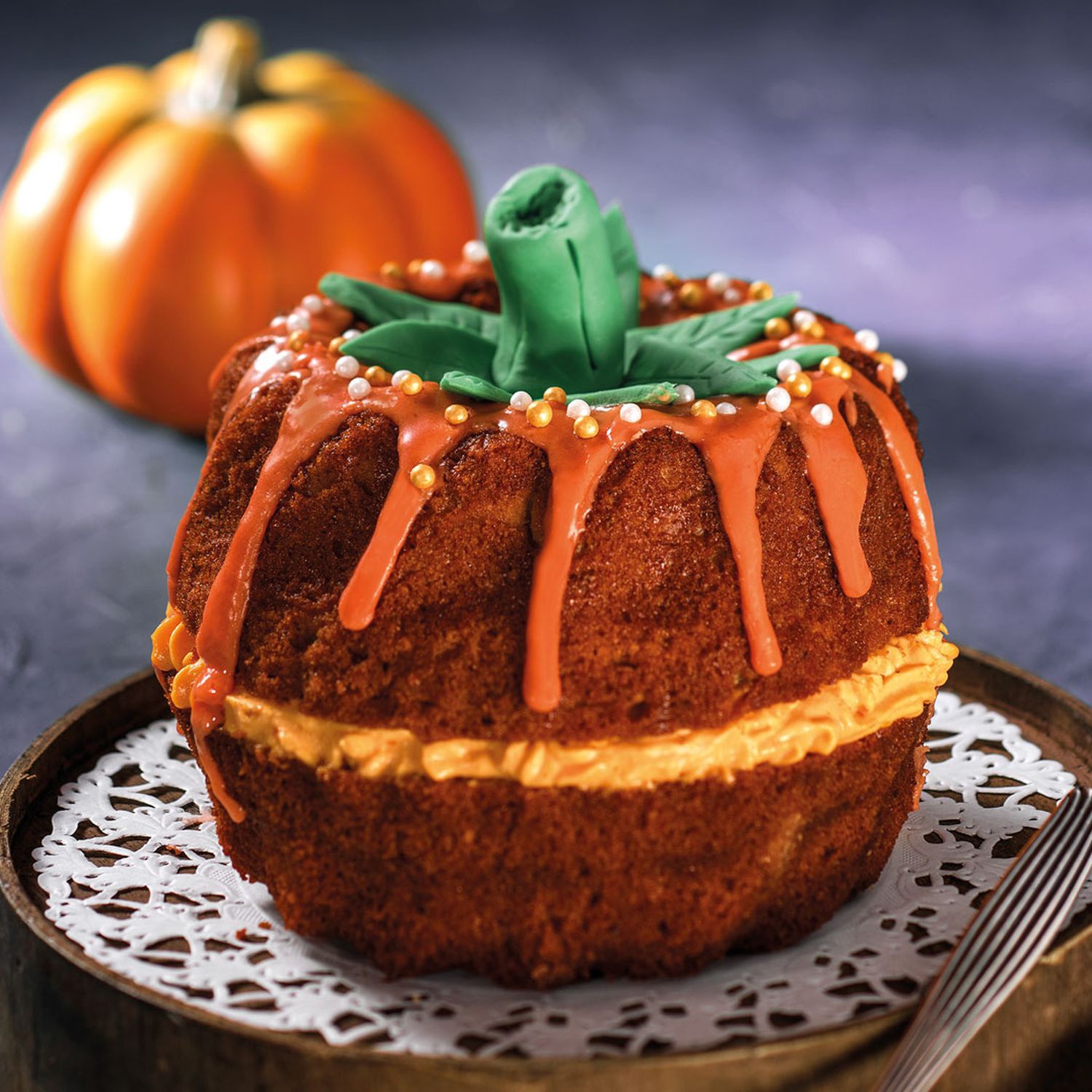 Abschließend ein Glas in die Mitte eines umgedrehten Kuchens stellen und den Kuchenboden mit der Creme einstreichen. Den zweiten Kuchen auf die Creme setzen. Die Glasur auf den Kuchen verteilen und mit dem Perlen Zauber bestreuen. Den Kürbisstiel und die Blätter auf dem Glas platzieren.
