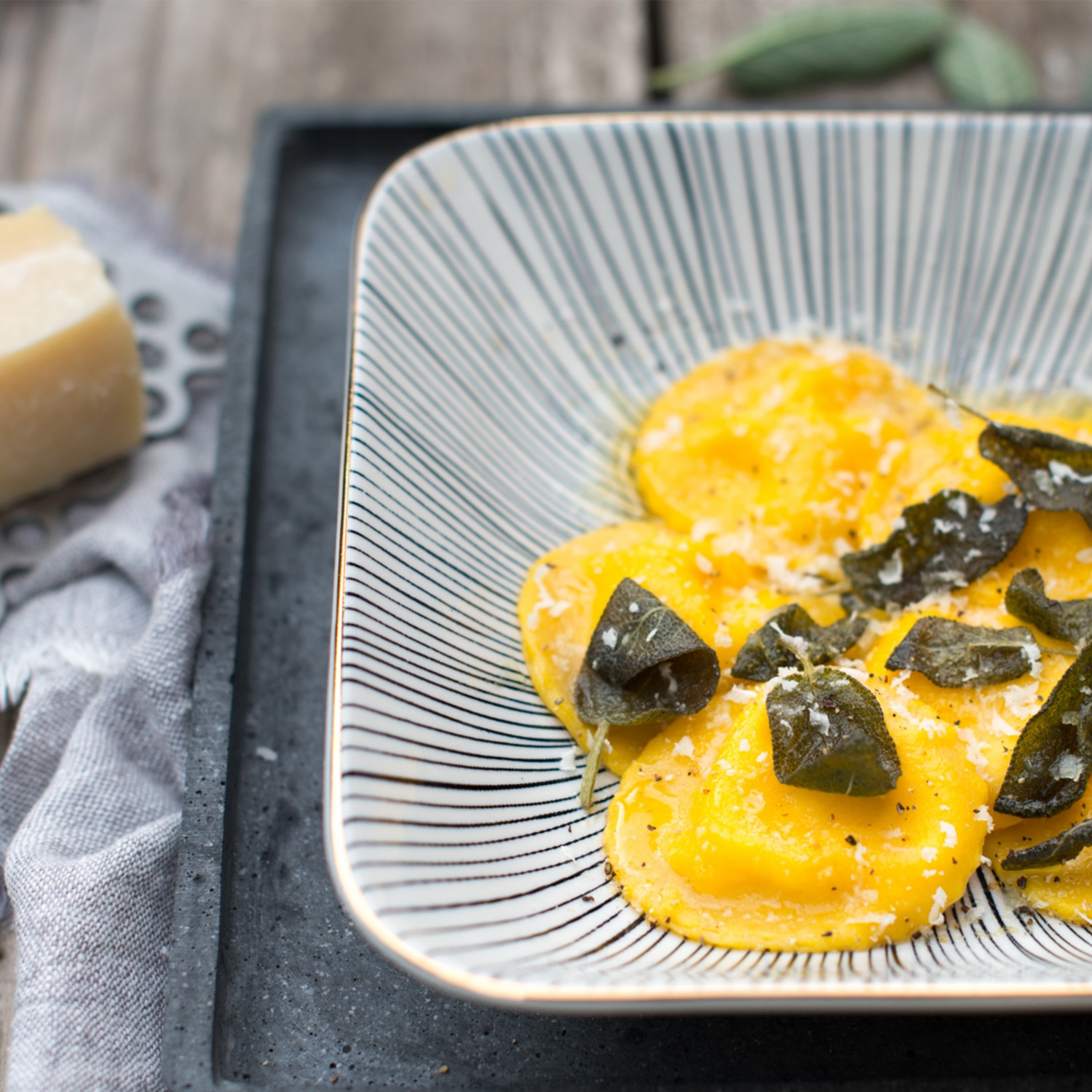 Unsere Kürbisravioli sind mit einer Fülle aus Kürbis und Hüttenkäse gefüllt und werden mit Salbeibutter angerichtet! Gleich nachkochen und genießen!