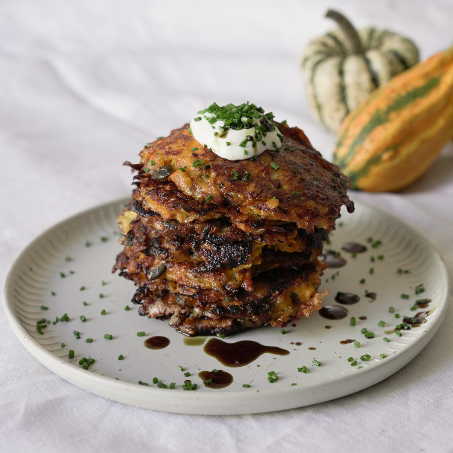 4. Die Rösti auf deinen Teller geben mit dem Sauerrahm anrichten und etwas Kernöl darüberträufeln.