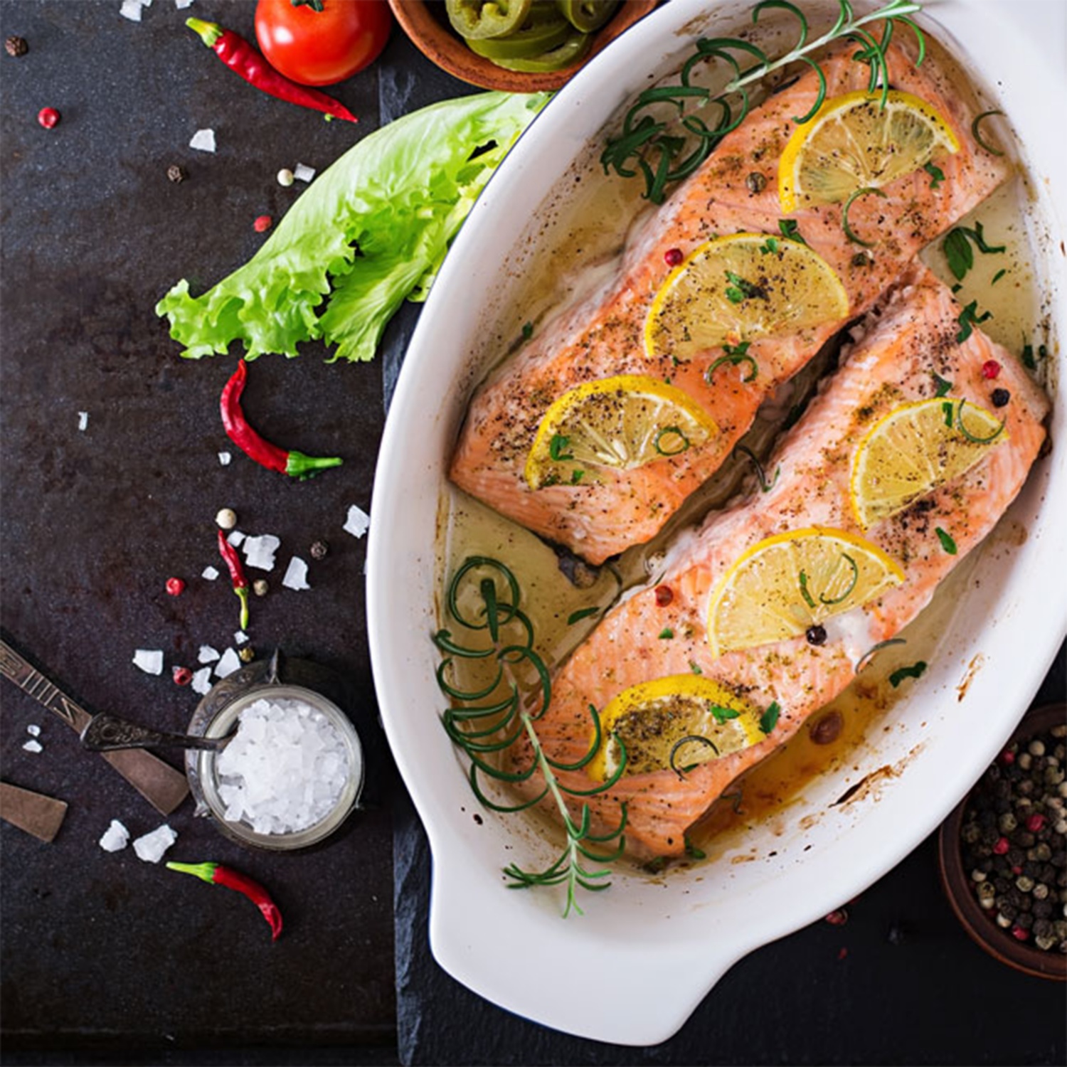 Den Backofen auf 200 °C vorheizen. Lachs in eine Auflaufform geben und gründlich mit Öl bestreichen.
