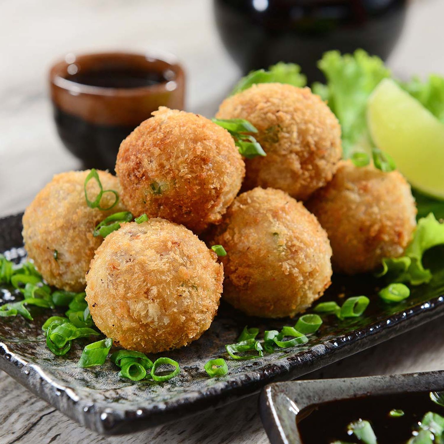 Koriander, Semmelbrösel, Zitronensaft, Knoblauch, Salz und Pfeffer unter das Lachsfaschierte mengen und zu kleinen Bällen formen (à 25 g = ca. 16 Stück aus der Gesamtmasse für 4 Portionen). Nun die Lachsbällchen in heißem Fett bei ca. 170 °C frittieren.