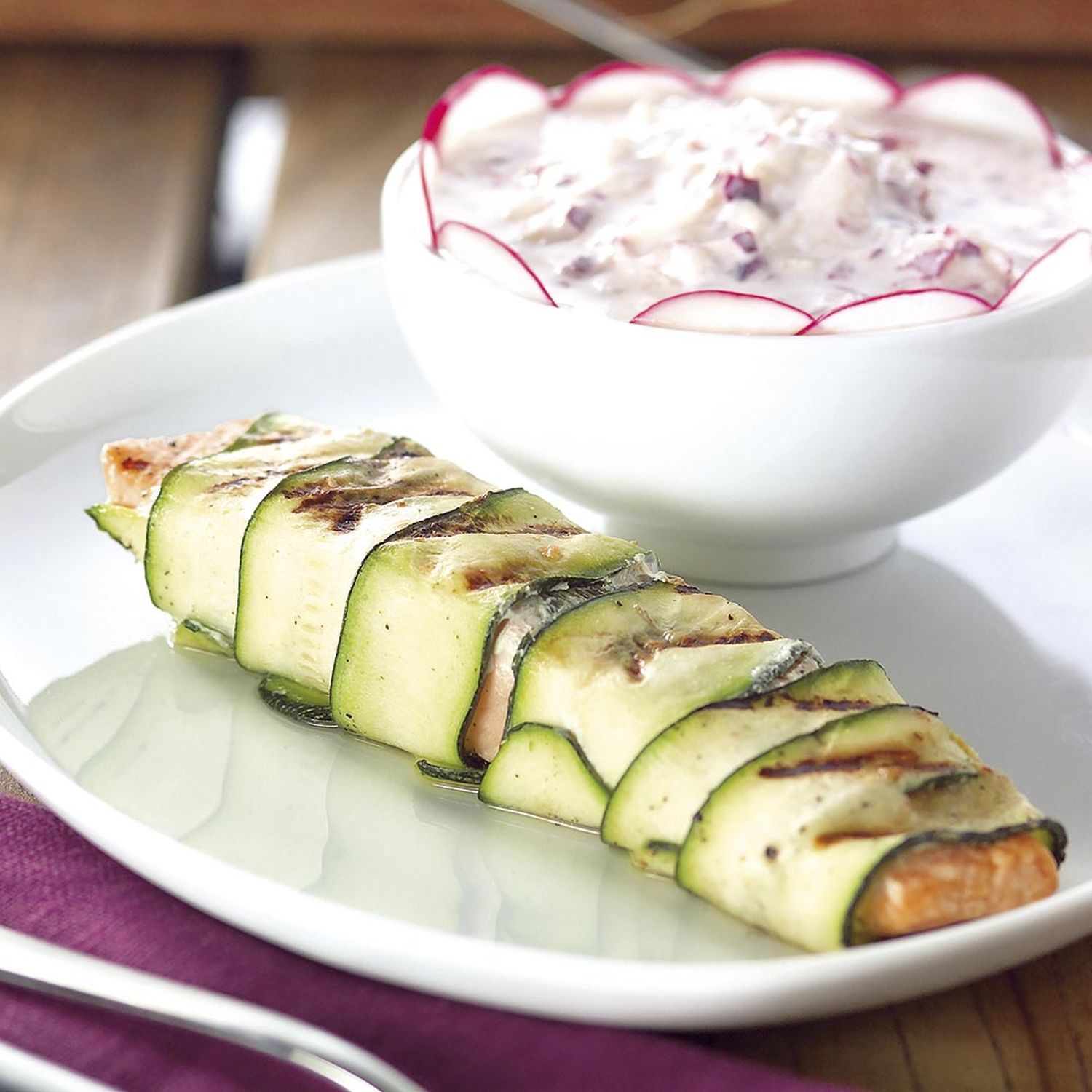 Die Zucchini waschen und der Länge nach in dünne Scheiben schneiden. Mit den Zucchinischeiben die gewürzten Lachsfilets umwickeln (eventuell mit Zahnstocher fixieren) und auf dem Grill in einer mit Öl bestrichenen Grilltasse von jeder Seite ca. 4–5 Minuten grillen.