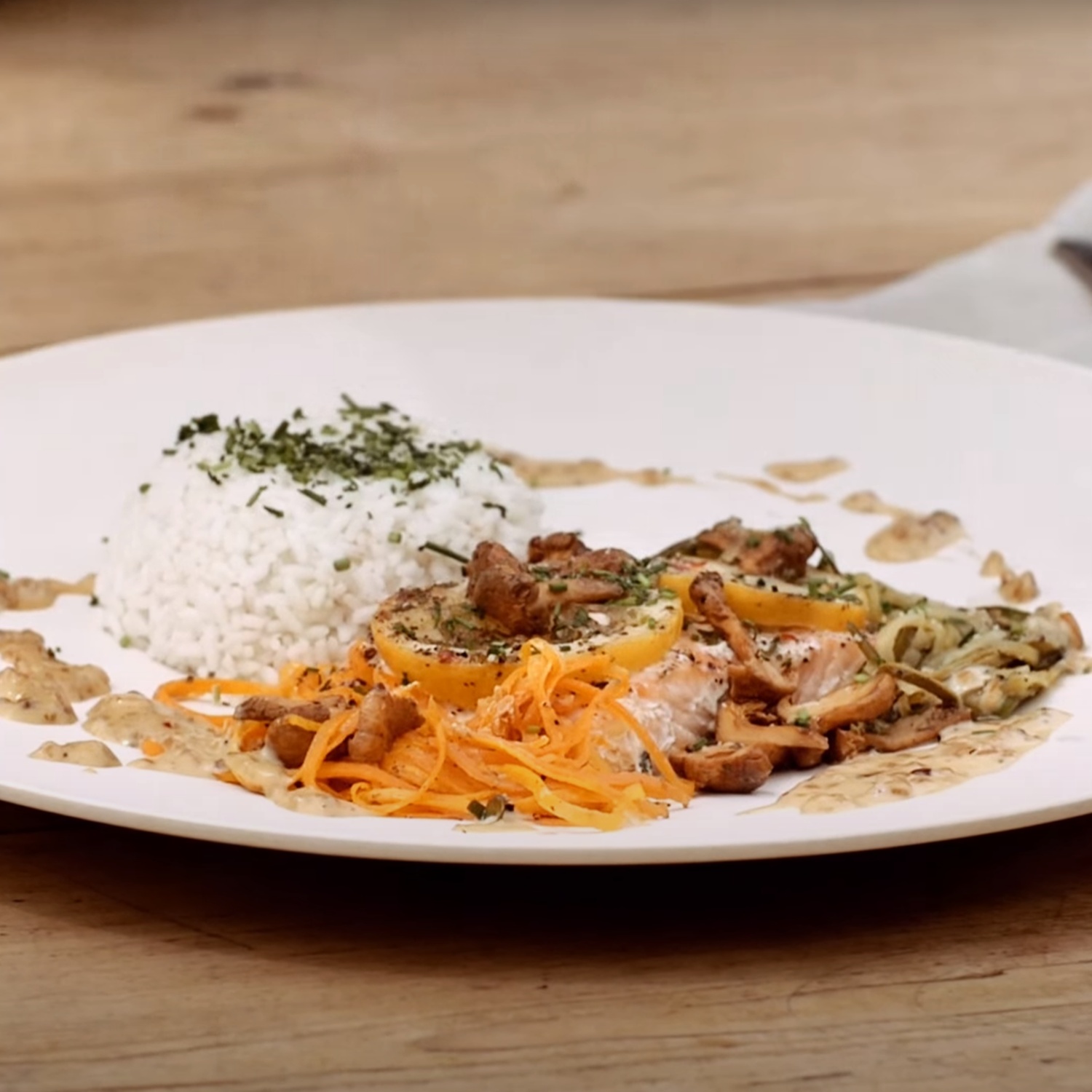 Reis, Lachsfilets mit Gemüse und Sauce anrichten – Mahlzeit!