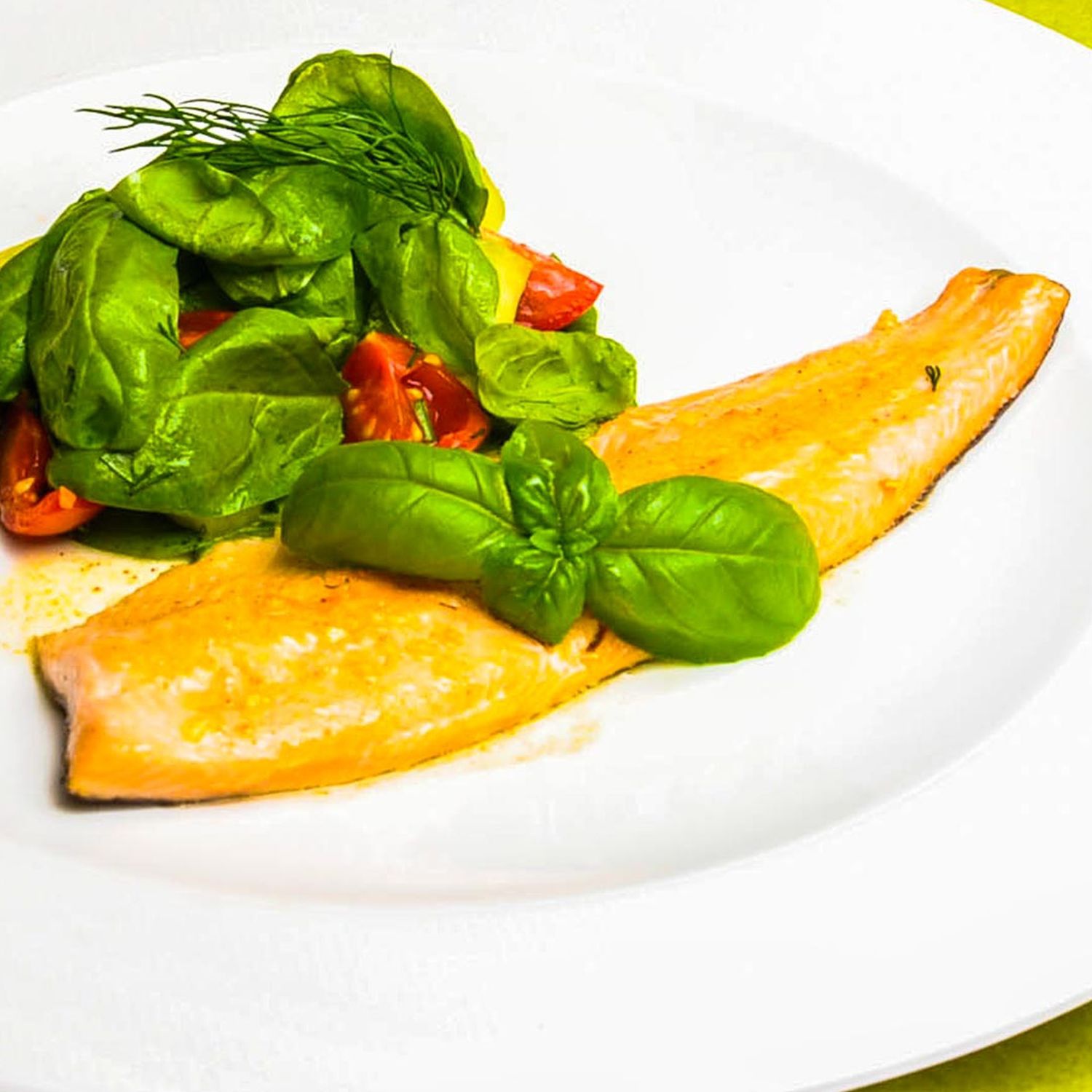 Lachsforelle in Ingwer-Knoblauch-Butter mit Spinatsalat