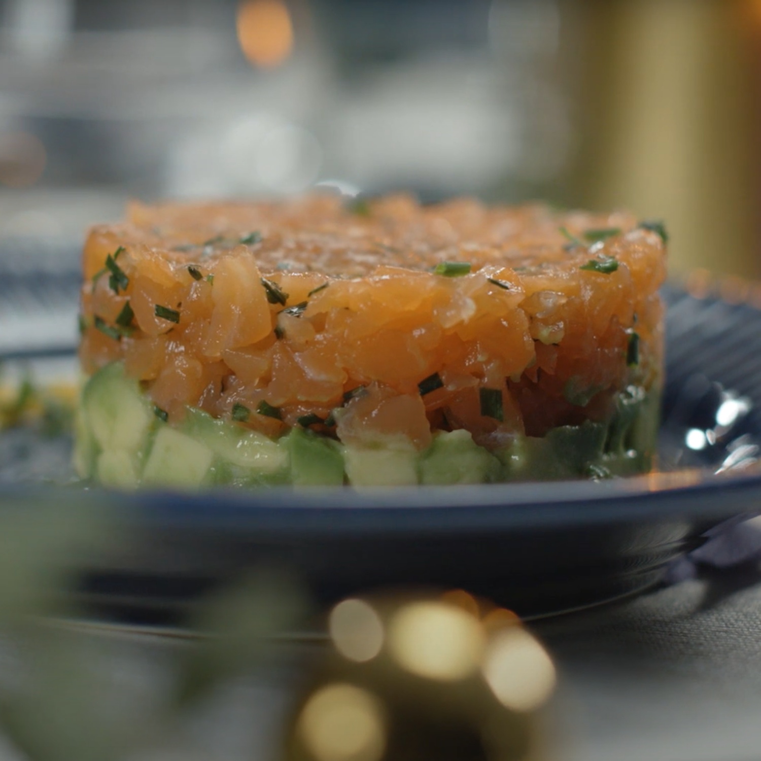 Die Avocado- und Lachstücke in einer Form schichten und gut festdrücken. Form entfernen, den Teller mit der Sauce verzieren und anrichten.