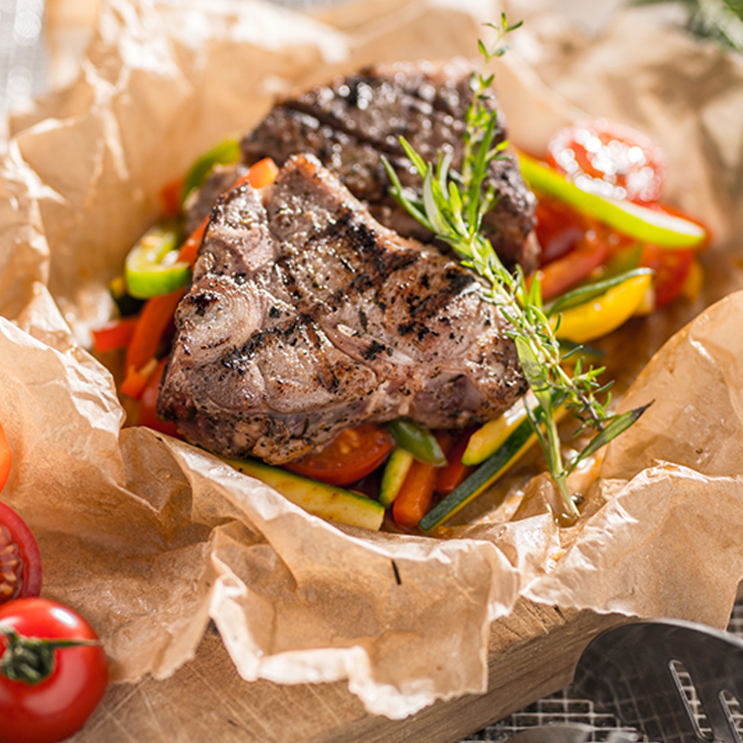 Das Gemüse auf dem Backpapier verteilen und je ein Stück T-Bone Steak darauf setzen.