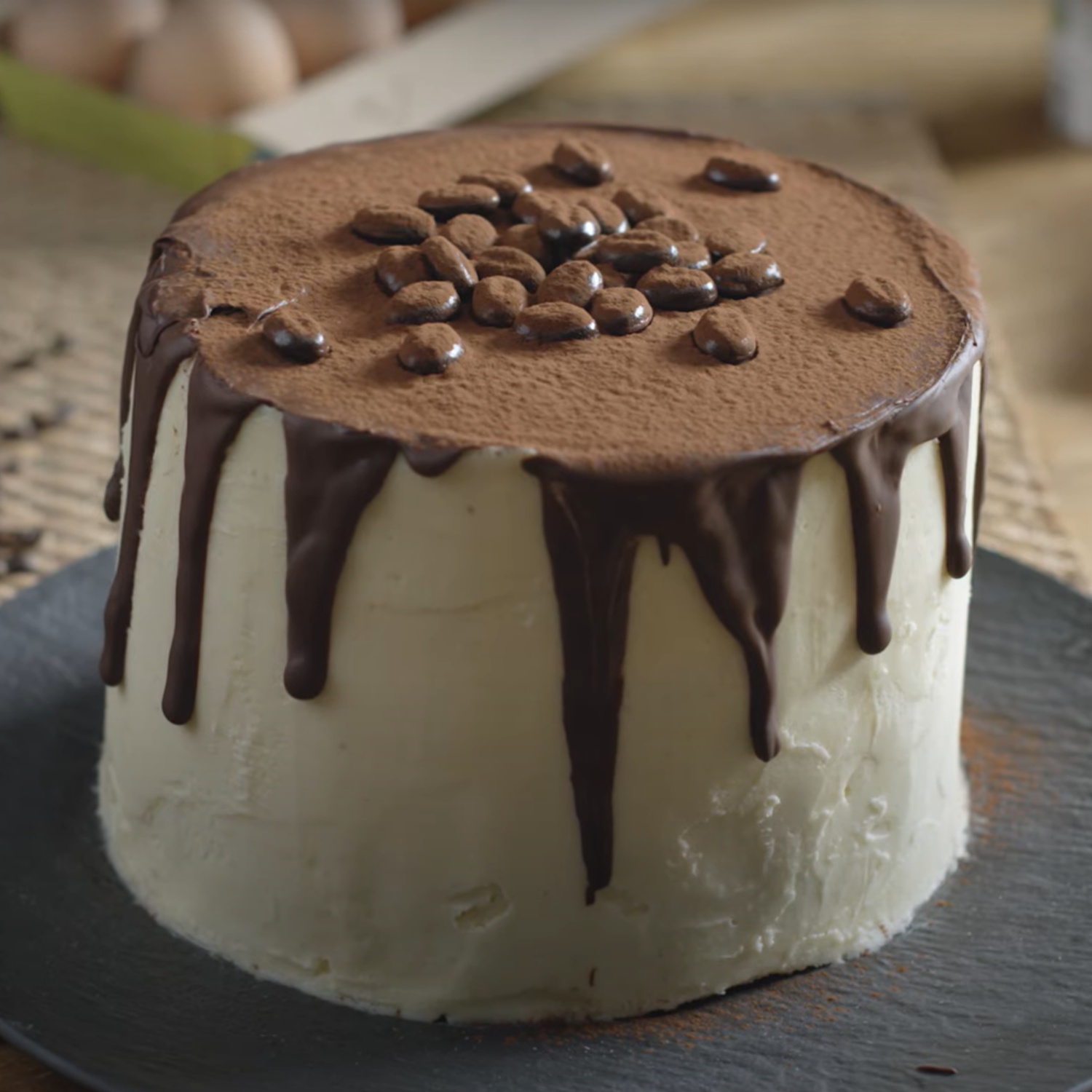 Torte mit Schokoladestreusel und Kakaopulver garnieren.
