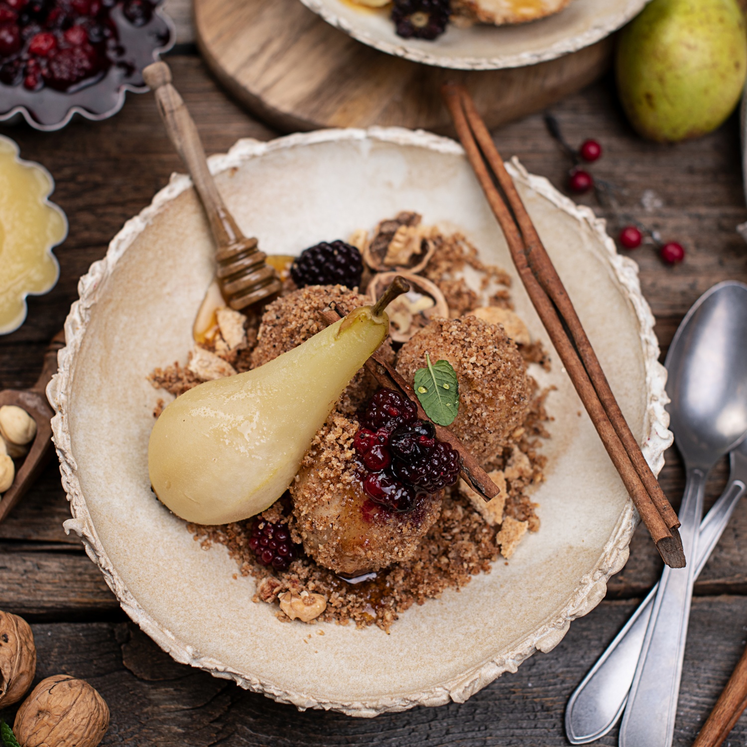Die Topfenknödel in siedendem Wasser für 12 bis 15 Minuten ziehen lassen {bis sie oben schwimmen}. Abseihen und rasch in den noch warmen Nussbröseln wälzen. Die Topfenknödel mit Nussbröseln, poschierter Birne und Beerenröster noch warm servieren.