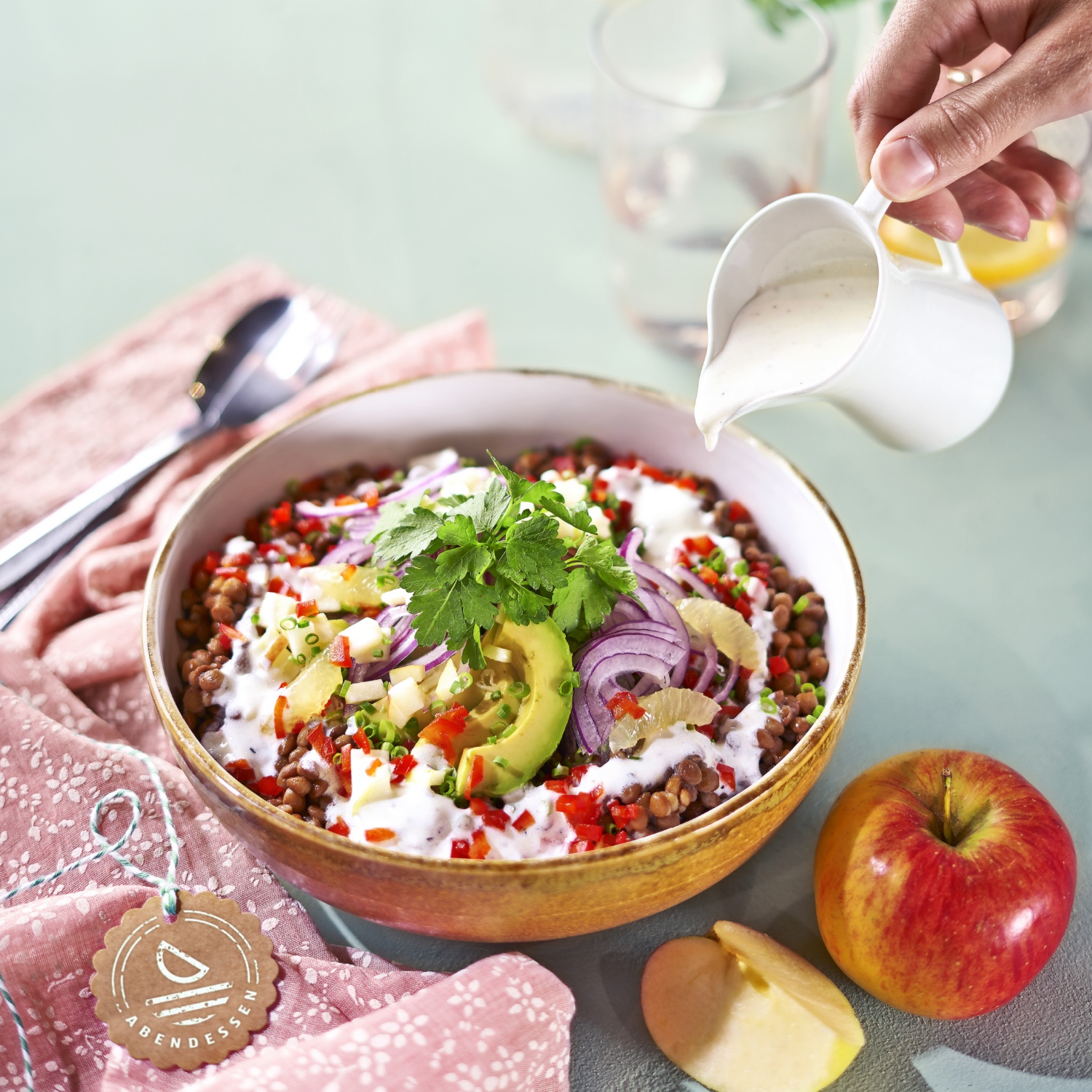 Für den Linsensalat, die Linsen über einem Sieb abgießen und mit kaltem Wasser abspülen. Linsen in eine Schüssel geben und etwas salzen. Avocado in Scheiben schneiden, Paprika und Apfel würfeln sowie die Zwiebel in Streifen schneiden. Obst und Gemüse auf den Linsen verteilen.