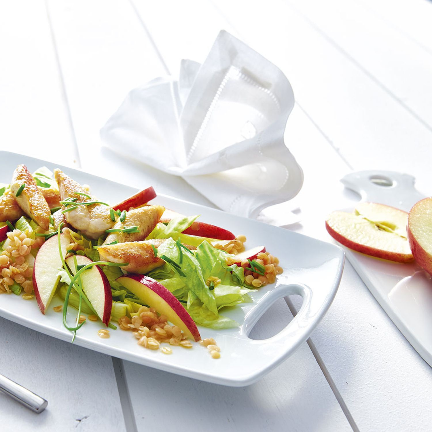 Äpfel waschen, vierteln, entkernen und in schmale Spalten schneiden. Den Salat gemeinsam mit den Linsen, den Apfelscheiben und dem Fleisch auf vier Tellern verteilen, mit Dressing beträufeln und mit Schnittlauch dekorieren.