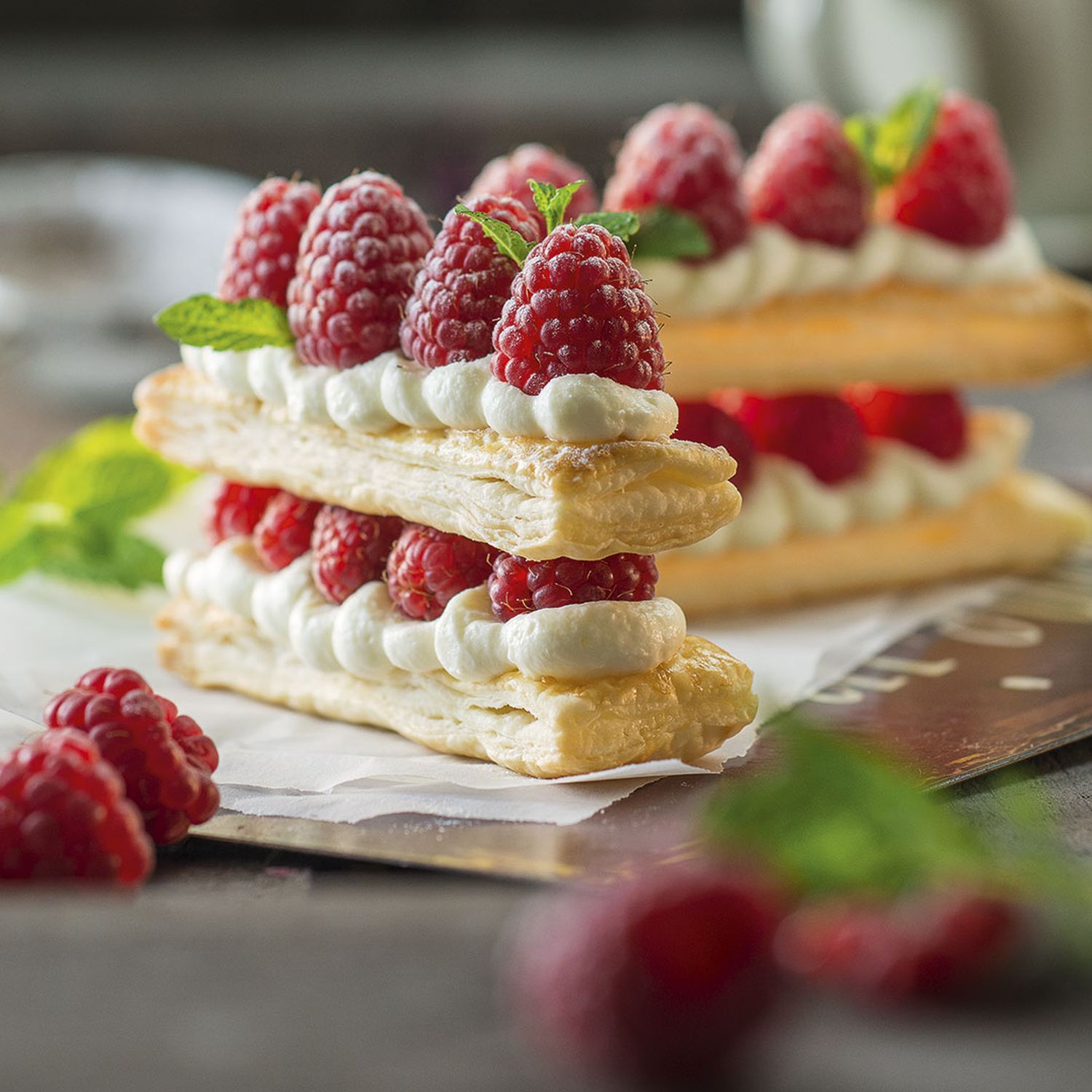 Blätterteig mit der Topfencreme bestreichen, Himbeeren darauf platzieren und den Vorgang wiederholen.