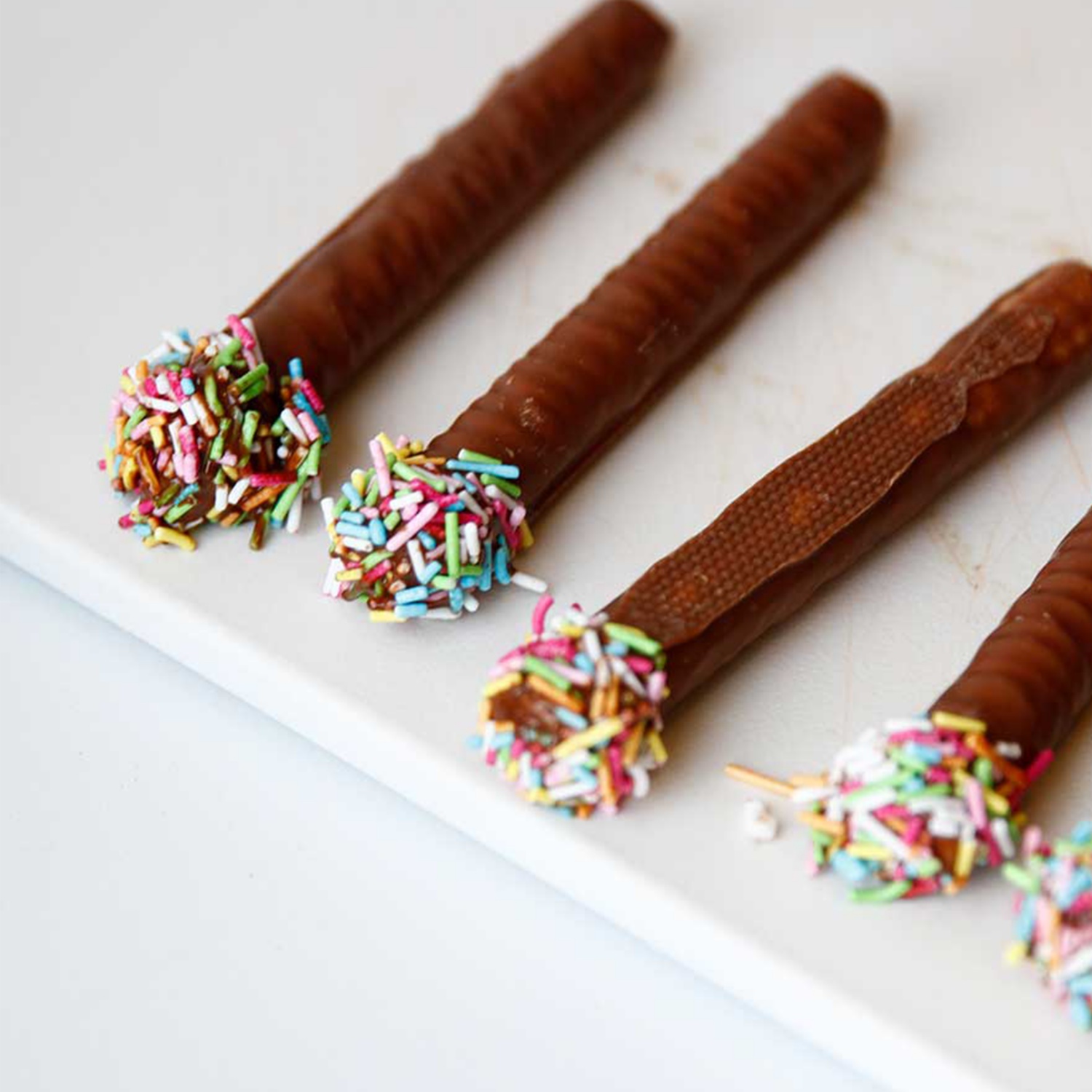 Nun die Haselnuss Stäbchen in die flüssige Schokolade tunken. Kurz abkühlen lassen und anschließend mit Streuseln dekorieren.