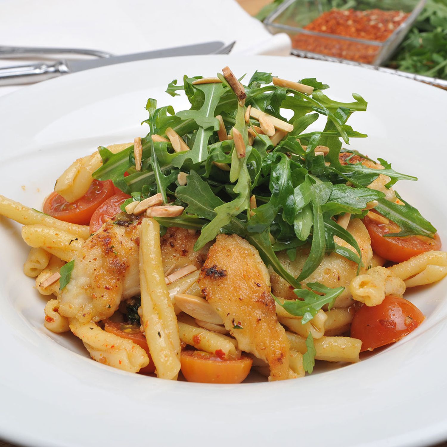 Die Nudeln in warmen Pastatellern verteilen, die Hühnerbruststreifen darauf anrichten und mit Rucola, Mandelsplittern und Parmesan bestreuen.
