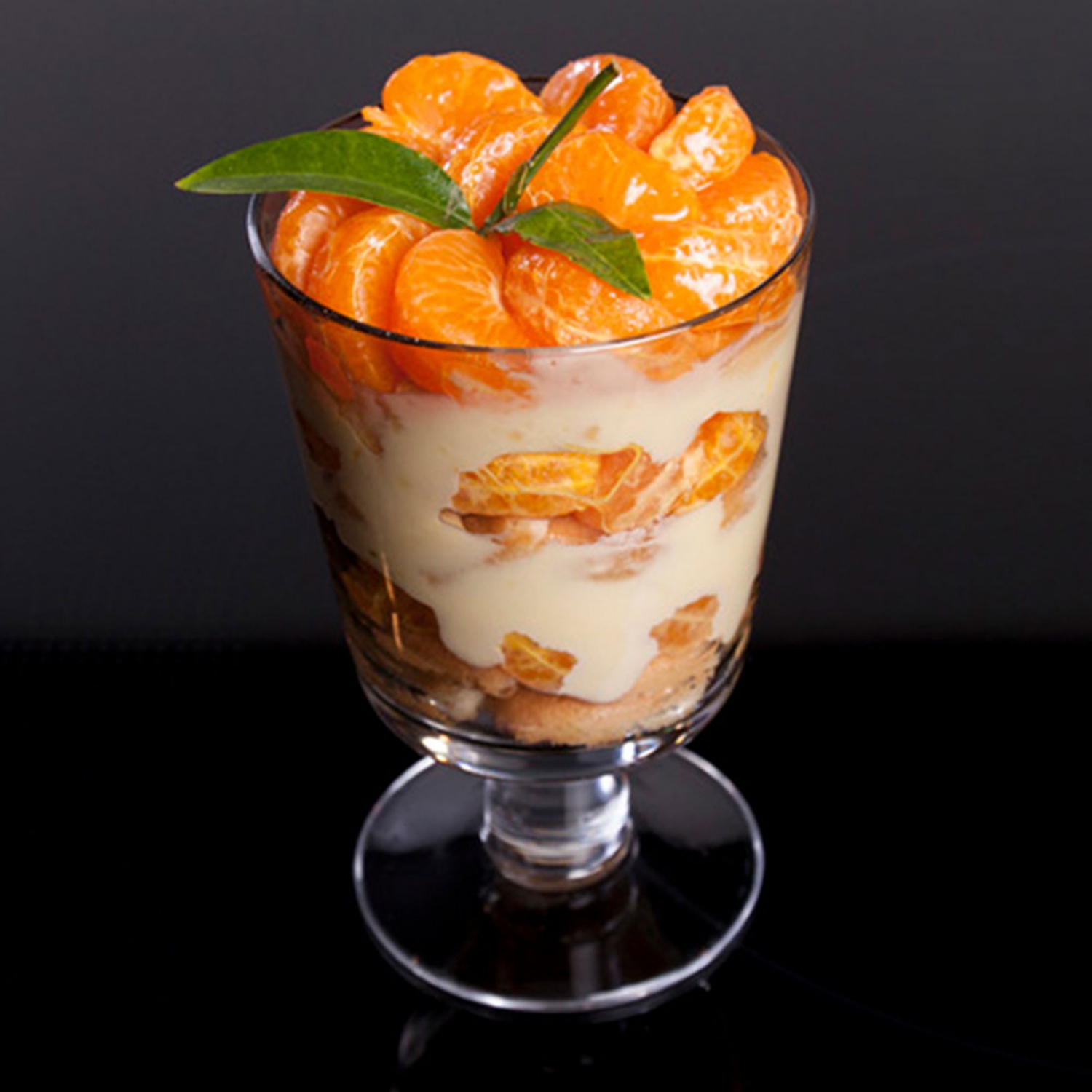 Den Trifle sofort servieren, mit einem Mandarinenblatt dekorieren.