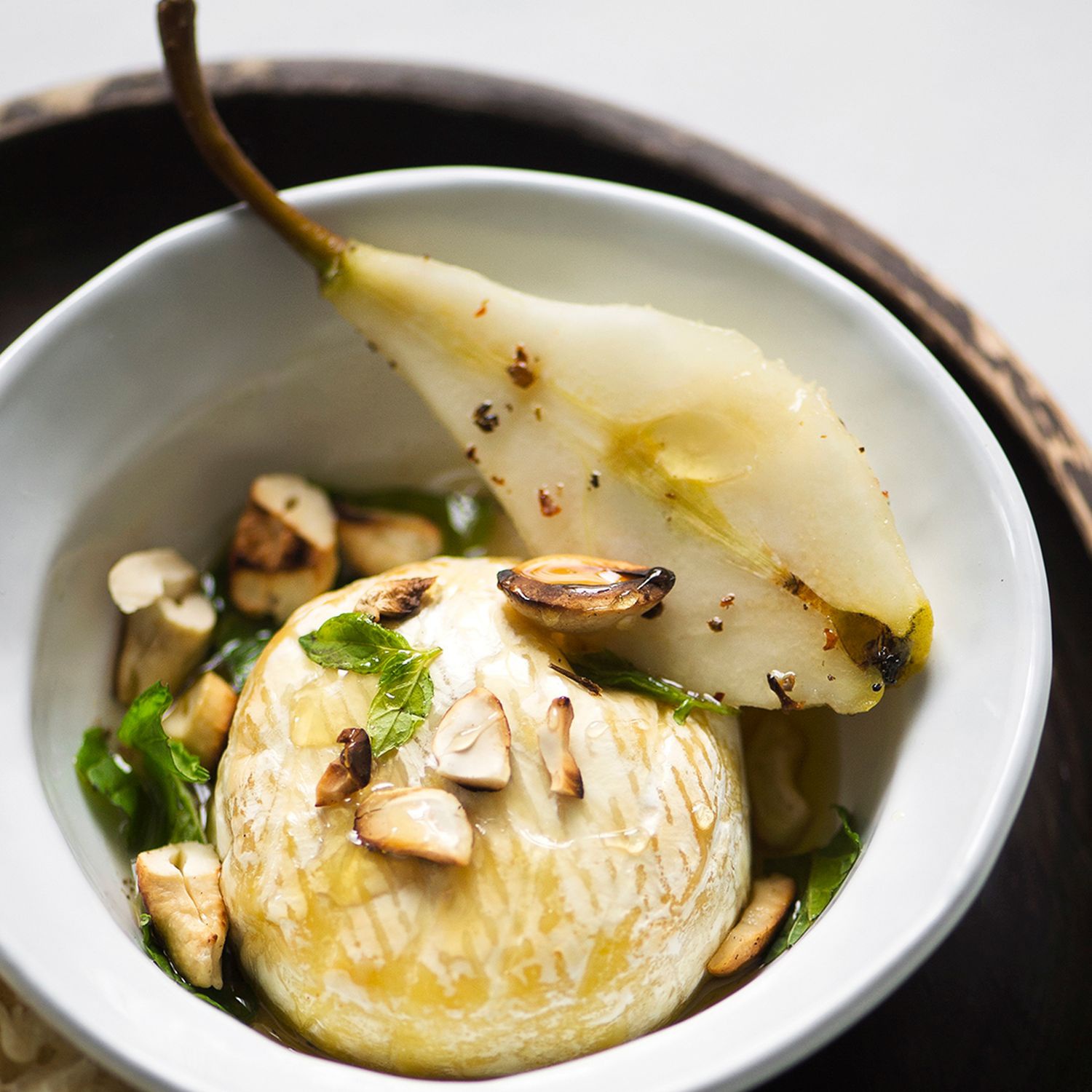 Brie aus dem Ofen nehmen auf den Tellern verteilen und gemeinsam mit den Birnenhälften anrichten. Restliche Marinade darüber träufeln und mit den gerösteten Cashewkernen bestreuen. Zum Schluss Honig darüber geben und mit Pitabrot servieren.