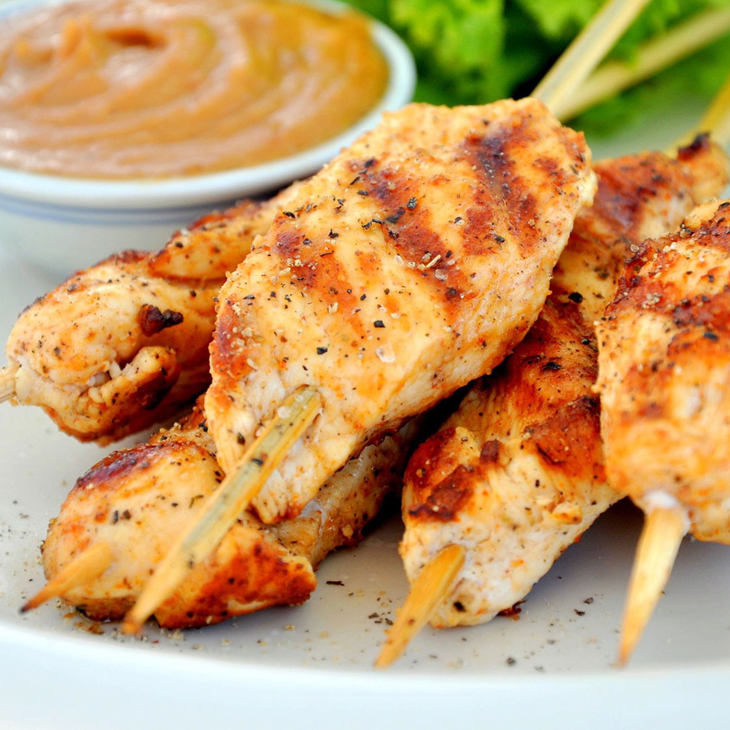 Die Hühnerfilets längs in möglichst gleichmäßig dünne Scheiben schneiden. Die Fleischstreifen durch mehrere Einstiche auf Schaschlikspieße fädeln. Das Fleisch sollte dabei gestreckt werden, so dass es flach am Spieß zu liegen kommt. Für die Marinade das Olivenöl mit dem BBQ-Geflügelgewürz und etwas Chili Salz verrühren, die Satéspieße damit einpinseln und nach Belieben etwas ziehen lassen.