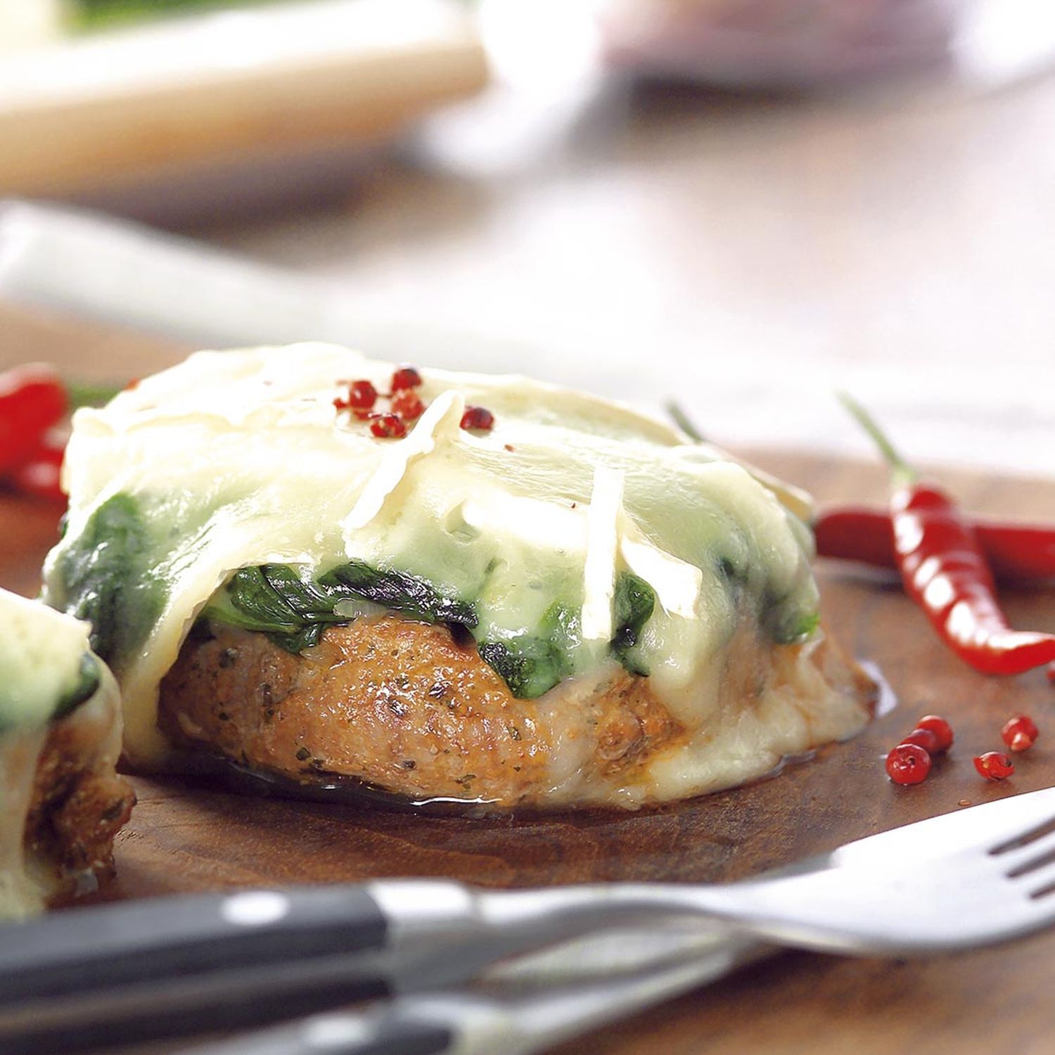 Mariniertes Schweinesteak mit Blattspinat und Brie