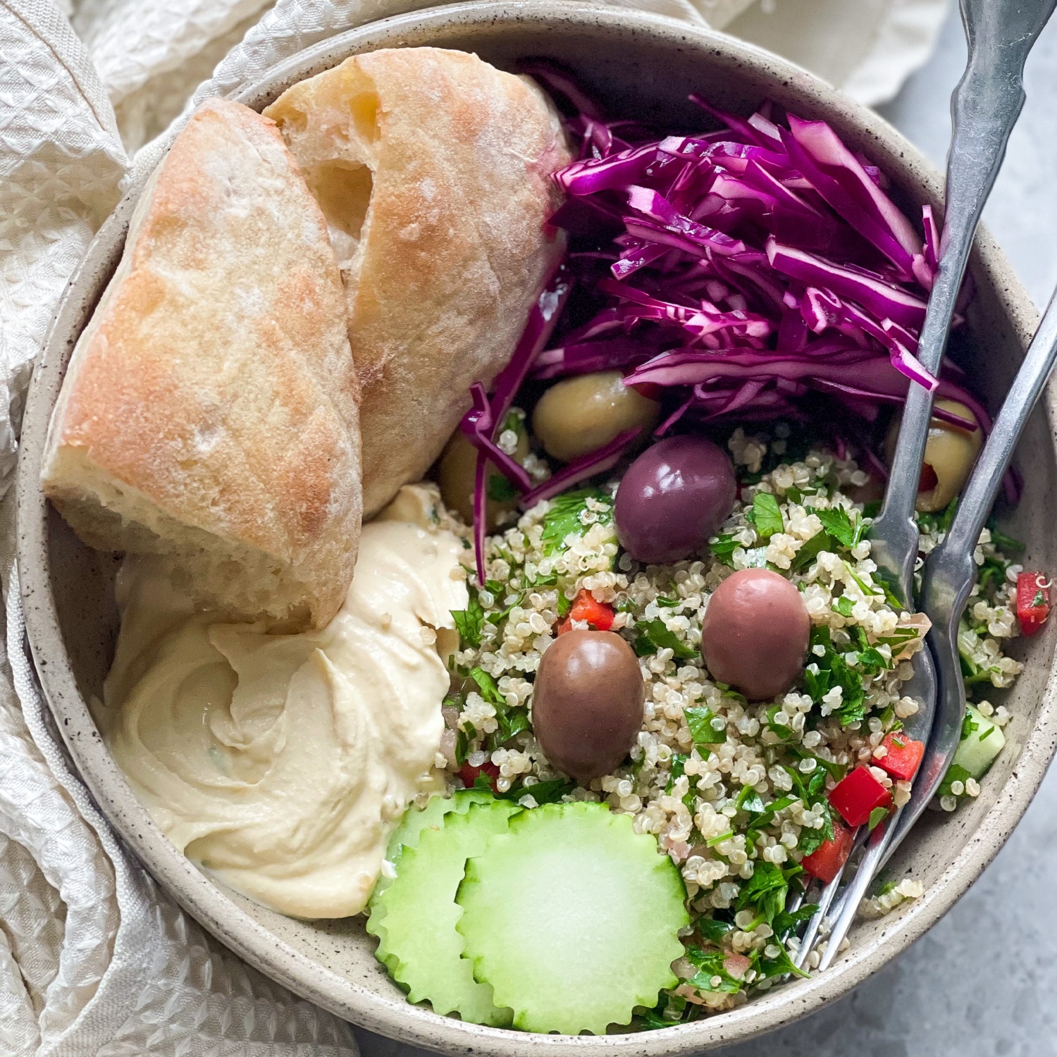 Quinoa-Salat, Hummus, Fladenbrot, Oliven und Rotkohl in eine Schüssel geben und servieren.