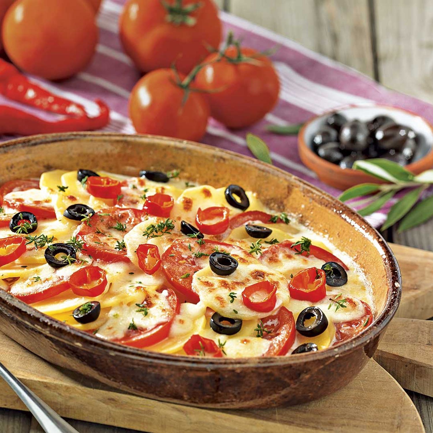 3. Währenddessen die Kartoffel- und Tomatenscheiben überlappend in eine Auflaufform schichten. Dann mit der heißen Milch-Mischung übergießen und für ca. eine halbe Stunde in den Backofen schieben.