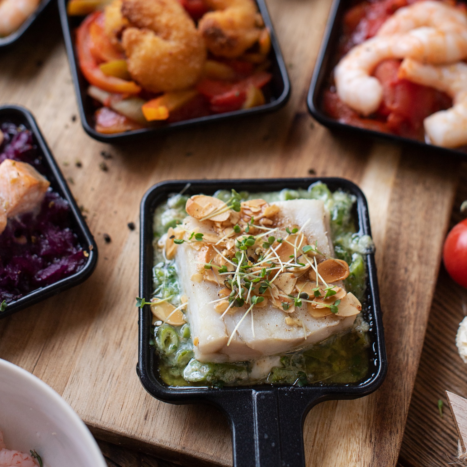 Letscho, Kartoffelstampf, Rahmfisolen, Rotkraut, Fisch und Meeresfrüchte in Schüsseln vorbereiten und am Tisch platzieren. Nach Lust und Laune Saucen und Fisch in Raclette-Pfännchen geben und mit Mandelblättchen bestreuen. Die Raclettepfännchen im Racletteofen garen.