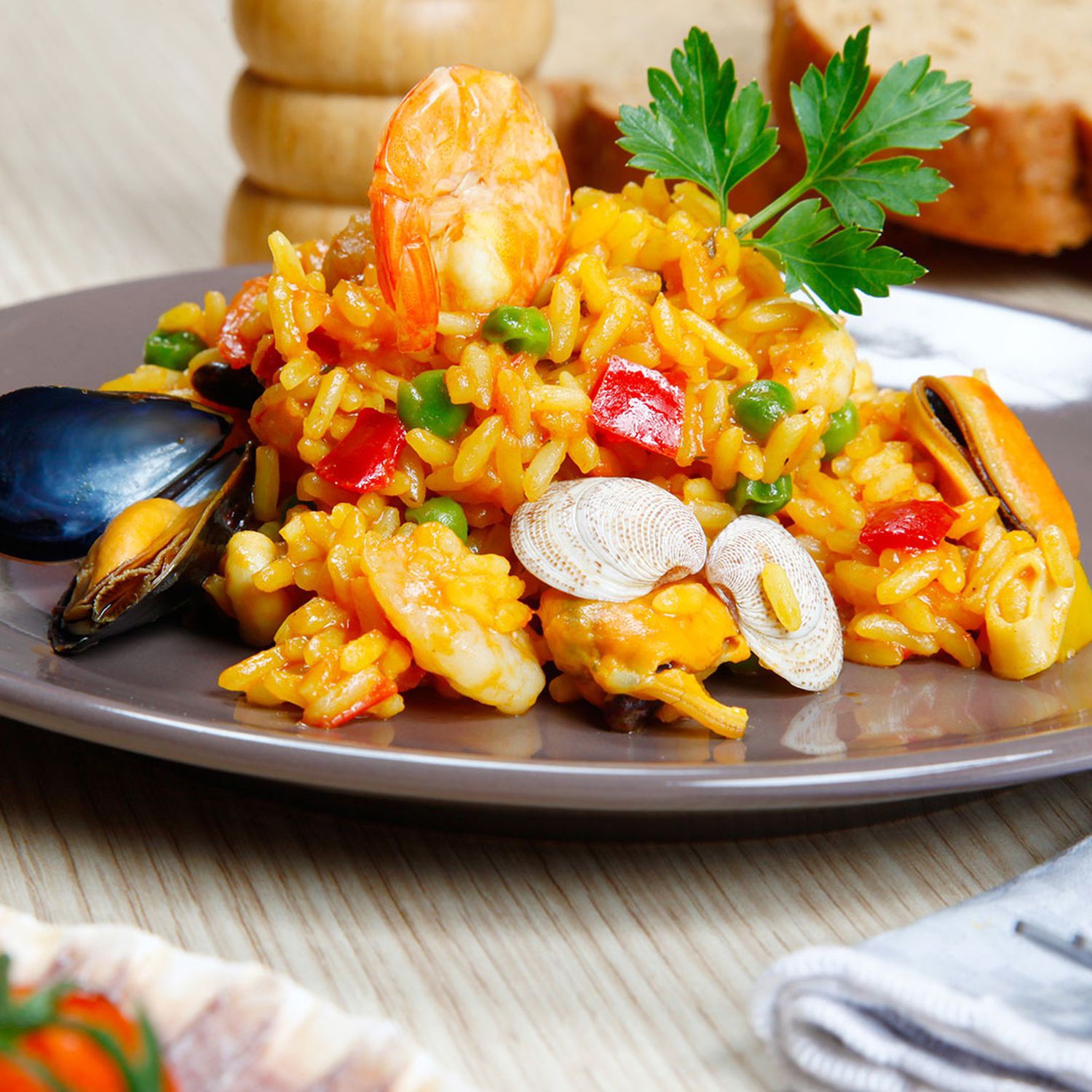 Den Reis auf warme, vertiefte Teller anrichten und das Gemüse darauf streuen. Fischstücke anlegen, die Garnelen darauf setzen und die Venusmuscheln darauf verteilen.