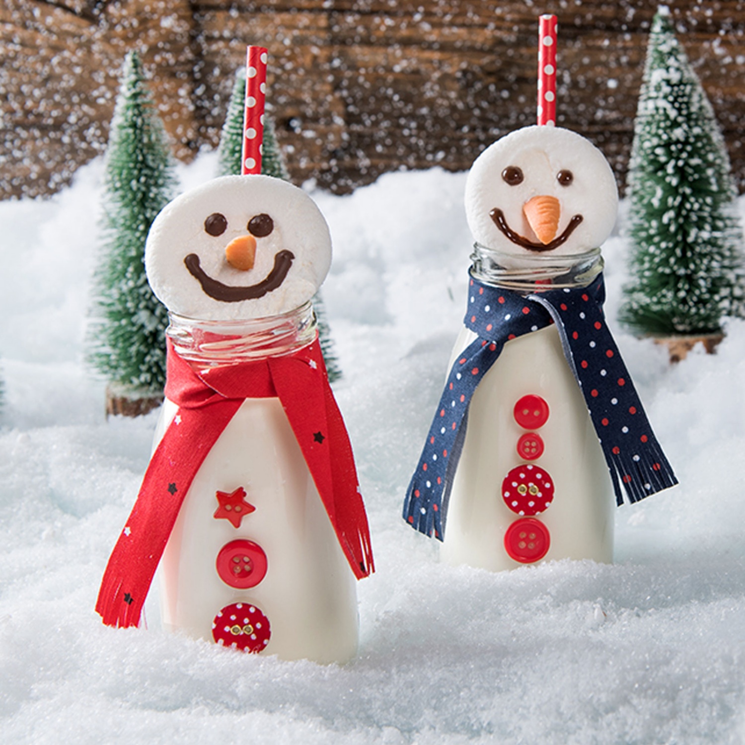 Die Schneemannköpfe auf die Flaschen stellen und servieren!