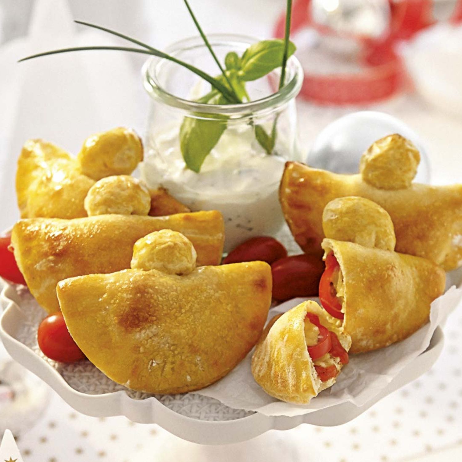 Für „kleine Engel“ kannst du aus dem übrigen Teig kleine Köpfe formen und diese vor dem Backen mit etwas Eiweiß an den geraden Seiten der Calzonen fixieren!